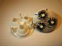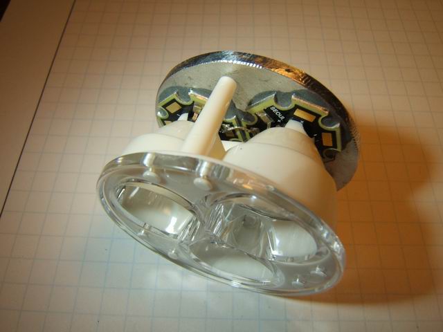The assembly must fit in the Mag-lite head perfectly and the following details the gruesome procedure. I snapped the stars onto the optics as in photo 3 above. The orientation of the stars should be + to and + to and + to so the series wiring will be minimal. You can see the polarity pattern in a photo below. Then with the head facing up, insert the slug and carefully put the tri-optic (with the stars attached) into the head. Turn over the unit and lift of the head, leaving the aligned slug and optics in position. I then carefully marked with a pencil where the stars were on the slug. Then using Arctic Silver epoxy I attached the star LEDs to the marked areas on the slug. Use the epoxy sparingly. Close but not exact alignment is required. Remember to make sure the polarity orientation is correct. The epoxy will cure in 15 minutes so you don't have a lot of time to waste. Snap the tri-optic over the stars and press down on the optics to squeeze out any excess epoxy. Clean any excess from the edges with a Q tip and alcohol. Carefully take the whole unit and flip it over so the tri-optic is facing down. Place the Mag-lite head over the heat sink plate, LEDs and tri-optic. Slip a piece of stiff paper under the assembly and carefully, turn it over and make sure that the optics are centered in the head as in the last photo below. Put pressure on the optics while it sets. Keep any excess epoxy on a piece of paper so you can monitor the curing process. When the epoxy seems to have firmed up, but not cured, you can flip the unit over and lift off the head carefully to make sure epoxy has not smeared on the walls of the head. If the assembly looks good, place the head back over the assembly and let the curing finish.