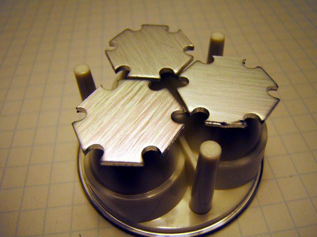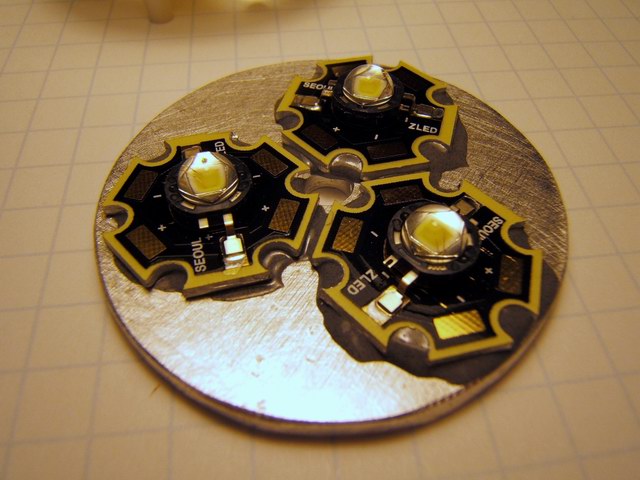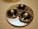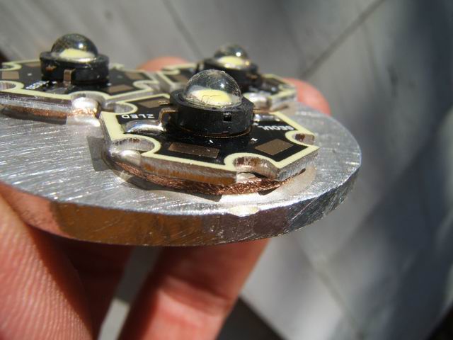 Note in photo 2 below one of the LEDs was found to be bad and is not wired. Always check the LEDs before epoxying to anything. To remove the bad emitter, I had to Dremel grind the copper emitter backing from the star backing, It had to be ground down to the point it was paper thin (to minimize the thermal mass) before I could use a soldering iron to remove the last of the copper slug. I later used Arctic Silver to bond a new emitter on the star. Lesson learned!