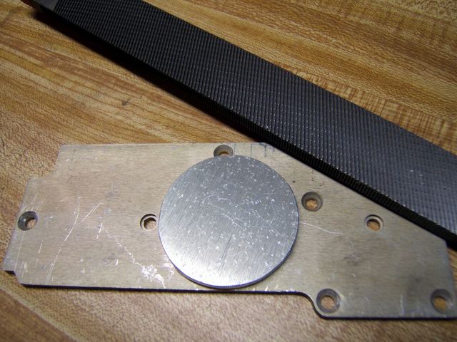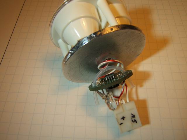 A round mounting plate and heat sink had to be hacksawed from a 1/8 scrap of aluminum. That takes about ½ hr with a good hacksaw and coarse rasp. A hole must be drilled exactly in the center for the power wires to pass through from the back. I sanded the top and bottom of the plate to make sure it was flat and would bond the LEDs well. It will drop into the head and rest on the bottom land. Thermal paste will complete the thermal contact for heat transfer.