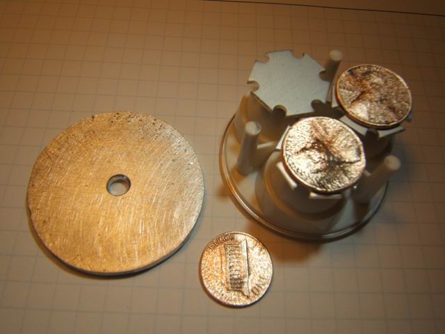 (Update) The above assembly procedure results in an unit that sits just slightly below the lip of the Mag-lite head. Subsequently the lens bezel does not force the tri-optic assembly down enough to make tight thermal contact with the land in the Mag-lite head. I had to use an O-ring as a spacer between the bezel and the lens cover to force the tri-optic assembly down tightly. I had to split the O-ring to get the proper diameter. This is seen in photo 1 below. In another Mag-lite conversion I used copper pennies as spacers under the LED stars to raise the LED up enough to allow the bezel to properly seat the optic assembly. The pennies (must be prior to 1982 to be copper) were cleaned and burnished with a high speed wire brush as seen in the photo 2 below. Arctic Silver epoxy was used to bond the LED stars and pennies to the heat sink plate, as seen in photo 4 below. Otherwise the assembly instructions can be followed with the inclusion of the pennies.