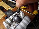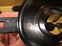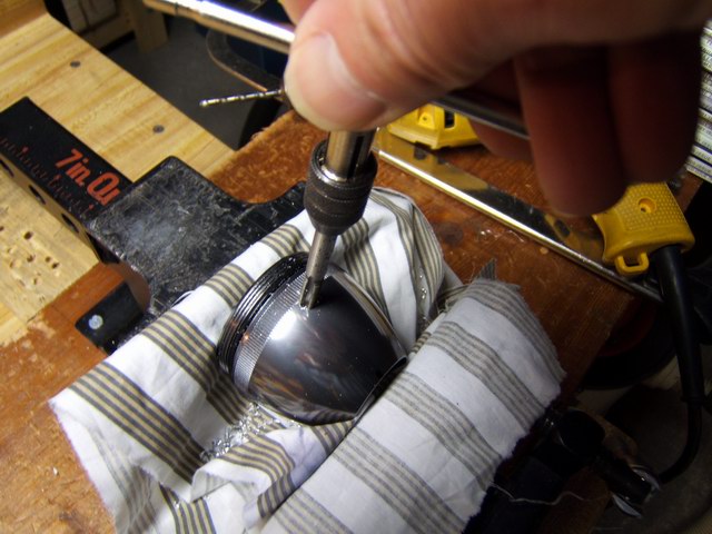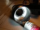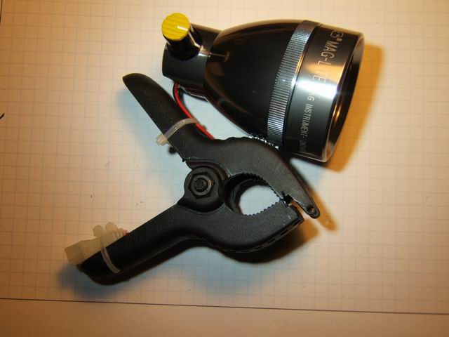 Prototype 8 was considered using DX SKU-5225 a prefabricated plate with three 3 watt LED emitters installed, but I used my own assembly with a 1/8” heat sink slug, With the extra parts I decided to finish that version using a “C” Mag-lite head. This plate is only 1/16” thick vs the 1/8” thickness for my hand cut slug in Prototype 8, but I wanted to see if it dissipates the heat. The LEDs appear to be Cree but there are no specs to be sure. The construction follows the same pattern as Prototype 8. You will have to drill and tap a hole in the head, being careful where it will go with relation to the clamp. To drill on a round surface, file a small notch then drill a pre hole with a small drill. Then enlarge the hole and tap it. I used ¼ x20 cap screw. You will have to saw off the excess length of the cap screw so that there is no interference inside with the LED assembly. I cut the battery barrel down as much as I could and still have room for the Luxdrive 3023 Buckpuck and the 5K ohm pot.