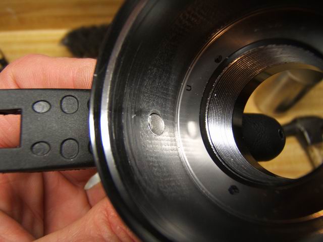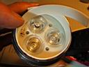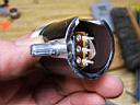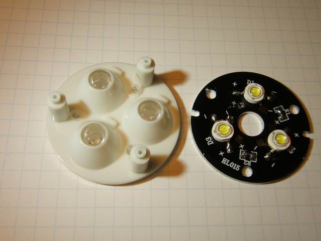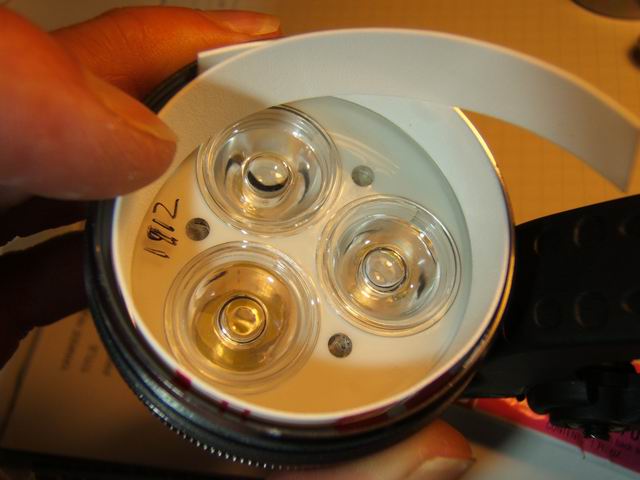The tri-optic lens I used was the DX SKU-1912 with a clear lens. Since the prefab LED plate has holes that match (another coincidence) the optic's feet, do not cut off the tips of the feet. They are needed for proper alignment of the lens. The feet tips are seen below. Then partially assemble the LED unit for wire lengths and then cut and solder all the wires. Install all the components from the front and check for fit and orientation. It is tight fitting everything in the “C” Mag-lite size.
