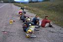 Here is an example of two friends touring in Alaska. (Click on thumbnail for larger image.) We all stopped for lunch, the only place being on the gravel along the side of the roadway. They had to lay their bikes over on the side, where mine in the backgound is standing up with easy access to lunch food, etc.
