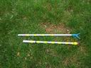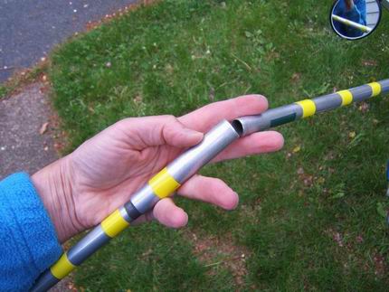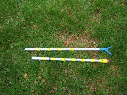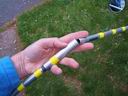 The tubing for my prototype (actually the only one made) is an old homemade tent pole with a sleeve section to allow joining the tube sections. One end has a plastic foot of sort, and the other end has a maple fork stuck in the end of the tubing. The wood fork was dipped in Plasti-Dip, a liquid plastic that when it drys produces a plastic waterproof coating. The yellow tape is just to make it more obvious so I don't inadvertently kick the pole away from the bike. Any tubing or wood stick can be used to the same effect.