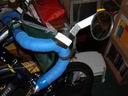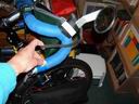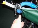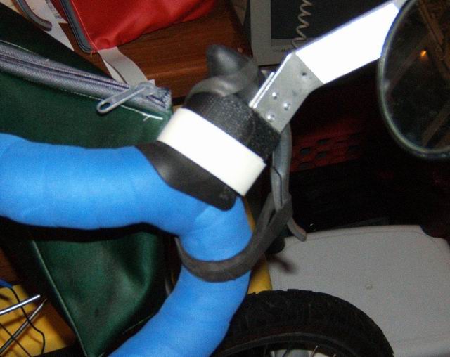 Note that if the bike is propped with the Bike Prop, it will have a tendency to roll forward or backward. To prevent the bike from rolling, I use elastic loops (inner tubes sections, again!) to lock the brakes. While these photos show aero-style brake handles, the idea can be used for any type of handlebar brakes.