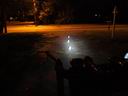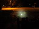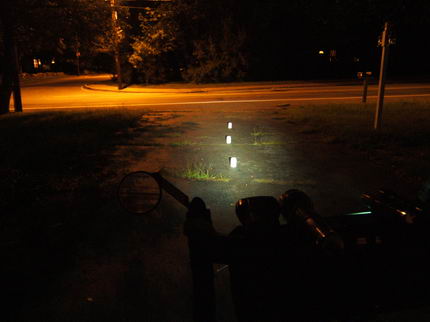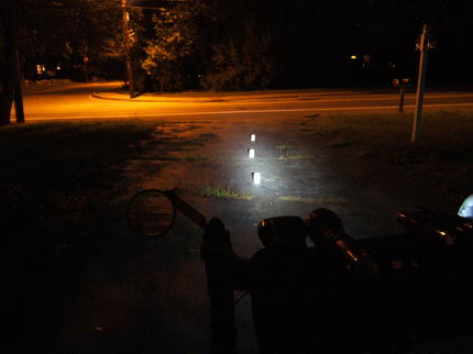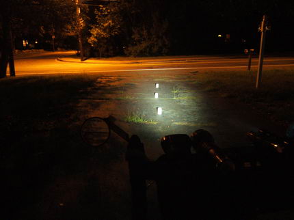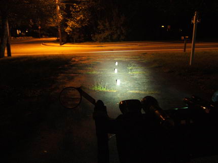 The following photos were all taken in my driveway from the same position on a bike. I used the same exposure on my digital camera with an ISO 400 rating. The streetlight across the street gives a comparison brightness and reference level for the photos. While the Cateye light seems insignficant in the photo, it is acceptable for slow riding in areas like a bike path. Likewise the last photo of the “Cheap” 20 watt light would be normally aimed farther out on the roadway because it has a tremendous reach. The lights were aimed about 15 feet in front of the bike. The white objects are milk-white jars, starting about 12 feet down a driveway from the bike and spaced about 6 feet apart. The orange street glow is typical of full-cutoff high pressure sodium vapor residential streetlights. It gives a reference intensity for the bike lights.