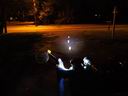 For a comparison of the bike lights, these photos show the relative differences in the light intensity. The low end standard is what was considered a strong LED light, the Cateye Opticube 5 LED model. The strongest is the “Cheap” 20 watt Maglite conversion. The Cateye is a weaker light but it will last over10 hours, while the Minimag light LED conversions (using 2300 mahr NiMH rechargables) last only about 3 hrs for the MadmaxLite model, and 1 1/2 hrs for the Madmax Plus model. Enough time to get you to your destination if caught with the sun going down. If you know you will be longer in the dark, carry a couple of extra AA rechargable NiMH batteries. The conversions (including buying the Minimags) are not cheap (about $60 each) but give excellent light comparable to tactical flashlights. The 20 watt conversion Maglite lasts about 2+ hrs on a 6.5 Amp-hr lead acid battery.