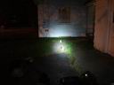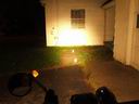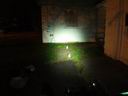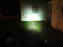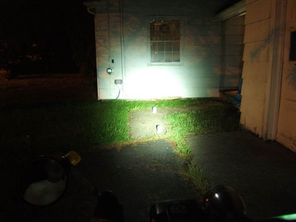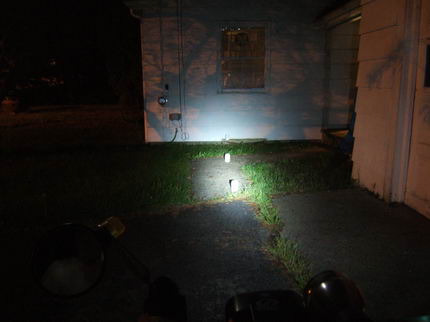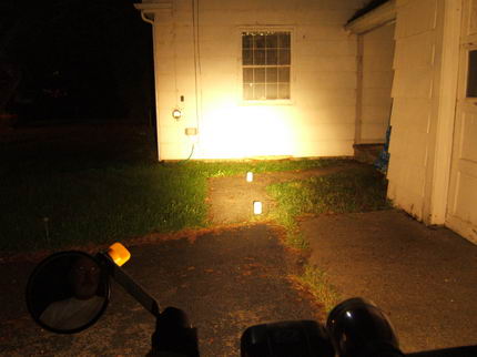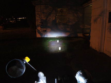 These comparisons were taken against a house white wall about 25 feet from the bike. The white objects are milk-white jars and are spaced about 6 feet apart. There is one against the white wall. These comparisons give a better representation of the frontal light intensity. The light orange glow on the right wall and on the far wall (tree shadow included) is from the sodium vapor street light off to the left.. The center intensity is overexposed on the white wall for the brighter lights. To go back to the driveway tests.