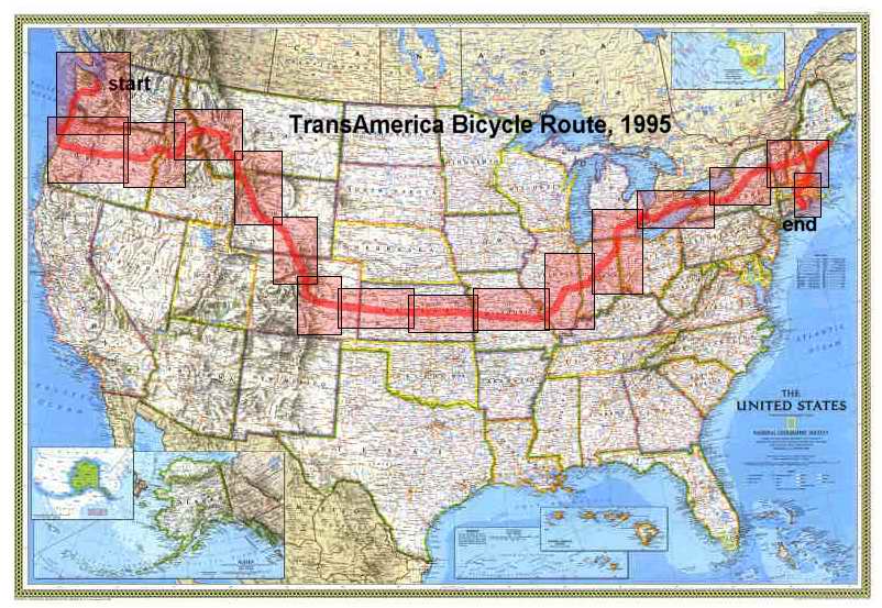 The route is a combination of the Pacific Coast route from Seattle to the middle of Oregon, the Central TransAmerica route to the Mississippi River, my own route to New York, the Northern TransAmerica route to Bar Harbor, Maine, and my own route to Rhode Island. Click on any detail map section to start viewing.