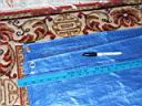 To use a single tarp I chose to use a 6 ft x 8 ft tarp folded in half. The resulting width is just an inch or so less than the commercial version. This is large enough for an average person, but if you want a larger one, use two 5 x 7 tarps. (Sometimes it is hard to find a store that carries such small tarps.) Just sew them on top of each other.
