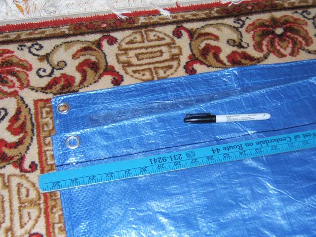 Most of these tarps are not square so the first thing is to fold over the tarp and square off the top and bottom as seen in the photos below. I then trimmed the grommets off the sides of the tarp (while still folded), trying to save as much width as possible. I used a single folded seam across the bottom and up half the open side.