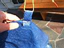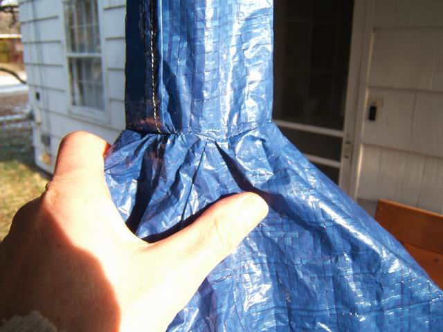 For this prototype I sewed tab loops on the top of the vent to suspend it from a tree or extended paddles. If you skip the tunnel vent, use some of the edge material you trimmed to form loops and sew them to the peak instead of on the top of the tunnel vent as I did. This will give you some place to suspend the shelter. Also seen in the photos are tab loops sewn at each of the four corners of the shelter to suspend the shelter in a tent configuration.