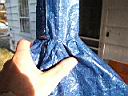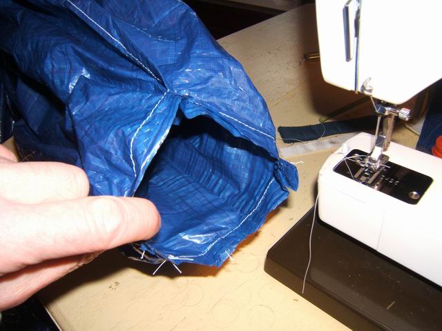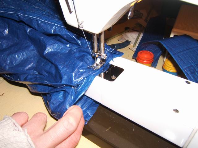 The vent on this prototype was sewn on the top of the shelter mainly to cover up the offset hole. I chose to make a tunnel vent and sew it onto the hole at the peak. I enlarged the hole to fit the vent. To do this you need a sewing machine that can do sew sleeves as seen in the photos below. It was a sloppy complicated sew because the blue tarp material does not stretch. In retrospect I would not recommend this method. It would be easier to just sew up the offset hole and forget about neatness.
