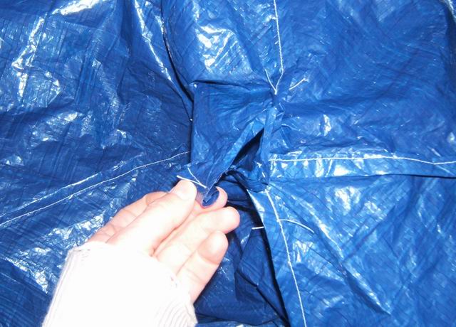 This next maneuver is even more bulky than the last one. You will sew both of the two sections together as seen in Figure 4. I suggest starting at the bottom on each side and sew up each side. It is just easier to manhandle the tarp starting this way. Again I used a flat folded seam. When you start joining the roof ridges, going up from the corner on each, you may find that because of sloppy tolerances, the peak does not meet perfectly. You may have an offset hole with too much material on one side, which is what happened to me seen below. Ignore that for now.