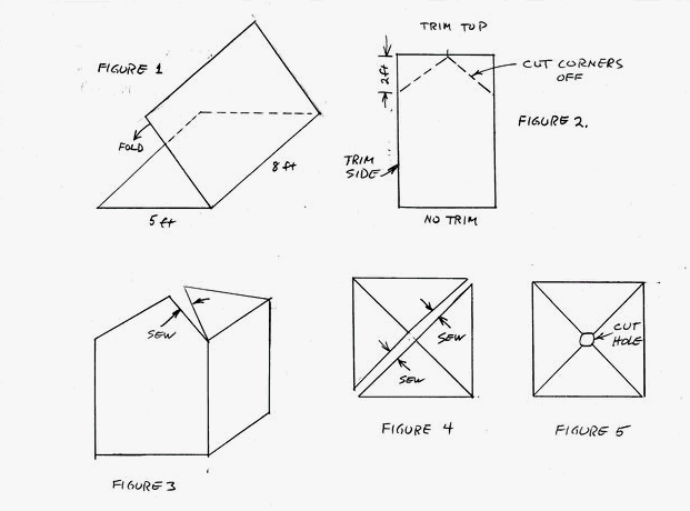 Cut off about 2 ft of the top corners as seen in Figure 2. You don't have to be exact here, but I mark the cut with a ruler and magic marker. This will form the peak of the shelter. Also do this for the second tarp. Try to get the side and cut corners all the same length on both tarps.