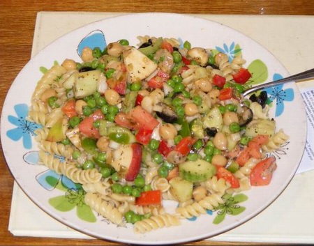 Rinse all fresh ingredients. Put water in 3 qt sauce pan to start boiling to cook pasta. Open can of Chick Peas and rinse and drain in strainer. Open can of olives and drain. Put frozen peas in another 3 qt sauce pan. Cut up the vegetables and mix in salad bowl. Cut olives in half and add. Add spices, olive oil, sweet relish, mustard, and Balsamic vinegar. When pasta is just cooked (al dente) pour through strainer and let hot water thaw the peas. Add a little olive oil to the drained pasta. Stir the peas and when thawed, drain in strainer. With all ingredients thoroughly mixed, add the peas and mix again. Do not mix the pasta and the salad in the salad bowl. Put layer of pasta on your plate and add salad on top.