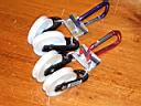 If a heavier kayak or canoe is to be hoisted and you want to use a multiple pulley system, you need to construct two or four double pulley blocks. Below is an example of a simple method of a making pulley blocks by drilling three holes through a thick bar of aluminum. While you don't need to be this fancy, just roping double pulleys together can cause tangling. The single pulleys are wired to the aluminum block with 5/32” wire rope and ferrels. The wire is run through as seen below and the aluminum ferrels are hammered against a vice to close them. The ends were treated with liquid plastic (Plasti Dip brand) to keep the wires from snagging on the rope. Mini-carabiners are used because they required smaller holes in the block. The elastic band keeps the mini-carabiner from shifting, and jamming at a cocked angle, when the rope is slack.