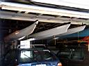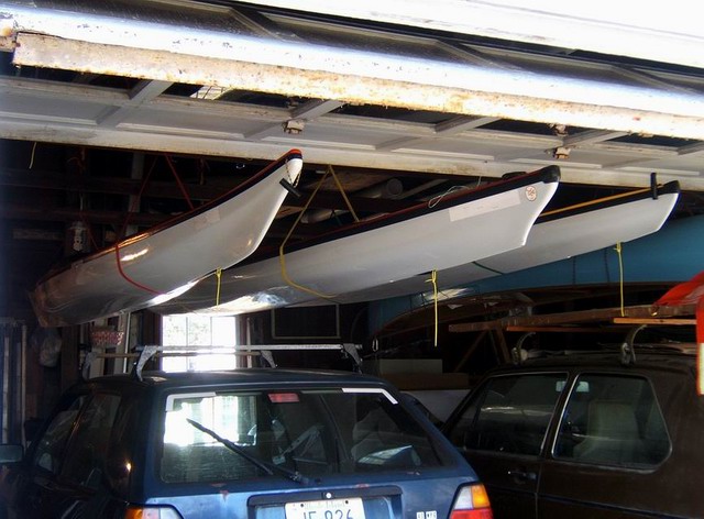 This kayak or canoe hoist system enables the user to lift and store their boat in a garage, saving storage space, keeping the kayak inside out of the weather, a little safer from theft, and a lot easier to lift on and off the car. If the vehicle can enter the garage with the kayak on it, the system works very well. If the vehicle is not a normal height sedan (mine is a VW Golf 66” high) the system can not be used to lift the kayak on and off the car because you will not be able to clear the garage door. The system uses common hardware available at most local hardware stores. The total cost (basic 3x system using mini-carabiners) is about $35. So far the system has been installed in 6 garages, and under one patio deck, totaling 14 installations.