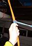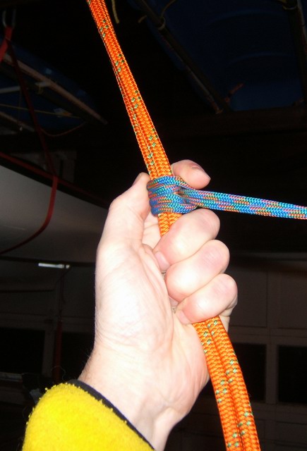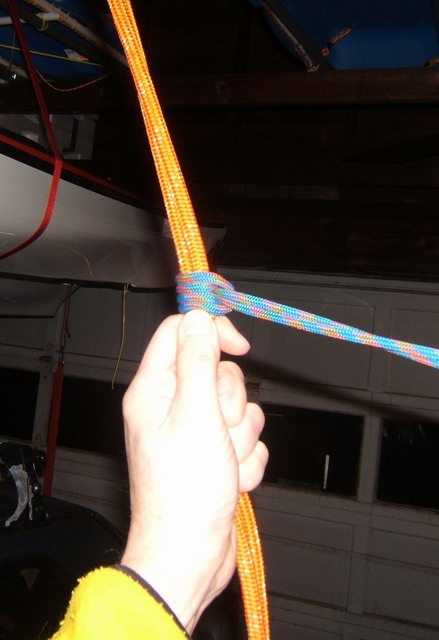 When raising or lowering the kayak or canoe, the prusik rope is never removed from the main hoist rope or the clip on the wall. You will soon develop a technique where you can use the left hand fingers to loosen and slide the knot while your right arm pulls the kayak up. Look closely at the fore finger and thumb in the photos below. The lower three fingers always have a grip on the ropes. The left photo shows lowering the kayak, and the right photo shows hoisting the kayak. If you have to pull the kayak up with two hands, pull it up a couple of feet then hold it with your strong arm while the other hand slides the prusik knot up the rope to take up the slack. Lowering is just the opposite.