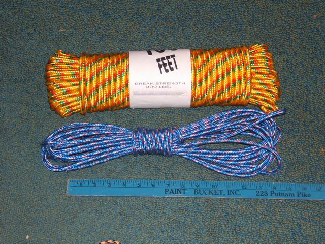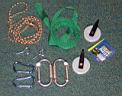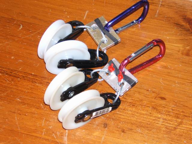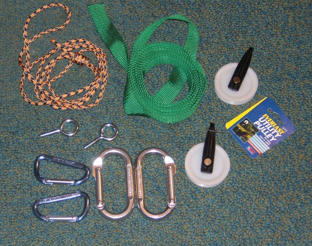 The main parts of the hoist are show below. The pulleys are 2 1/2” clothesline pulleys available at most large hardware stores. If you have real carabiners (about $5 ea) you can use them or to save money use the small “mini” carabiners. The rope should not be a hawser-laid type rope (which twists under load), but 1/4” to 3/8” nylon or poly kernmantle type rope ($7 for 1/4” x 100 ft at Lowes). It took about 100 ft of rope for hanging a kayak near the peak of my garage. If you use the 3/8” rope you may have to file out the pulley opening a little to keep the rope from binding as seen the the third photo below. The thicker rope is not needed for strength, but is easier to grip. Women find it easier to grip if the kayak is heavy. The sling that goes around the kayak is 1” nylon webbing (about 40 cents/ft). You will need about 2 x 10 feet for a kayak. It is sewn into a loop and the top is stitched to form a hole for the carabiner. The attachment to the rafters and wall studs are 5/16” x 4” eye bolts placed through drilled holes. If you have to fasten the hoist to a blank wall, drill a pilot hole into the edge of a stud or rafter and use a screw eye lag. Be sure the screw is in the center of the stud or rafter and that it is able to handle the load. If you don't feel safe, install two screws. Realize that with 4 connections (for a 3x system) to the roof, each is carrying either 1/3 or 1/6 of the weight of the kayak, and the wall prusik is carrying 1/3 the load.