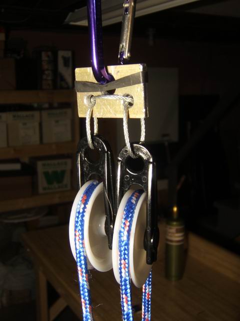 The photo below shows a double block under about 40 pounds load. Any arrangement of pulleys must consider allowing the pullys to remain parallel and free from interference. To see a full installation of a heavy double kayak using a 4:1 double pully system see this photo album.