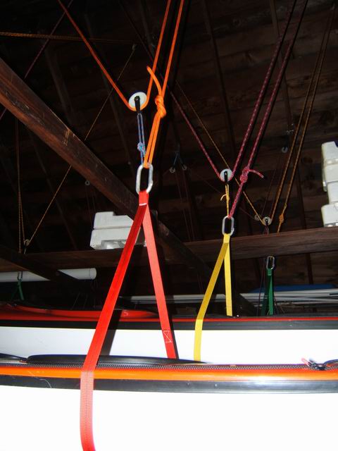 As an important safety feature, the kayaks are not directly tied up with a cleat or hook. A prusik knot is used to keep the kayak under control at all times. The knot is an old climbing knot that locks tight when pulled on, but can be loosened easily with the fingers to slide it up or down on the main rope. The prusik knot is a loop of 5 or 6 mm rope, which has the bottom clipped into a carabiner attached to a wall eyelet bolt. The upper end of the loop is wrapped around the two main hoist ropes with a prusik knot. The two ropes are pulled at the same time. In the photos below the main hoist ropes (overkill with 10.5 mm climbing ropes) come down from the roof pulleys with the tension taken on the prusik knots. A good look at the knot is in the middle photo. The right photo shows the carabiners clipping the prusik loop to the wall.