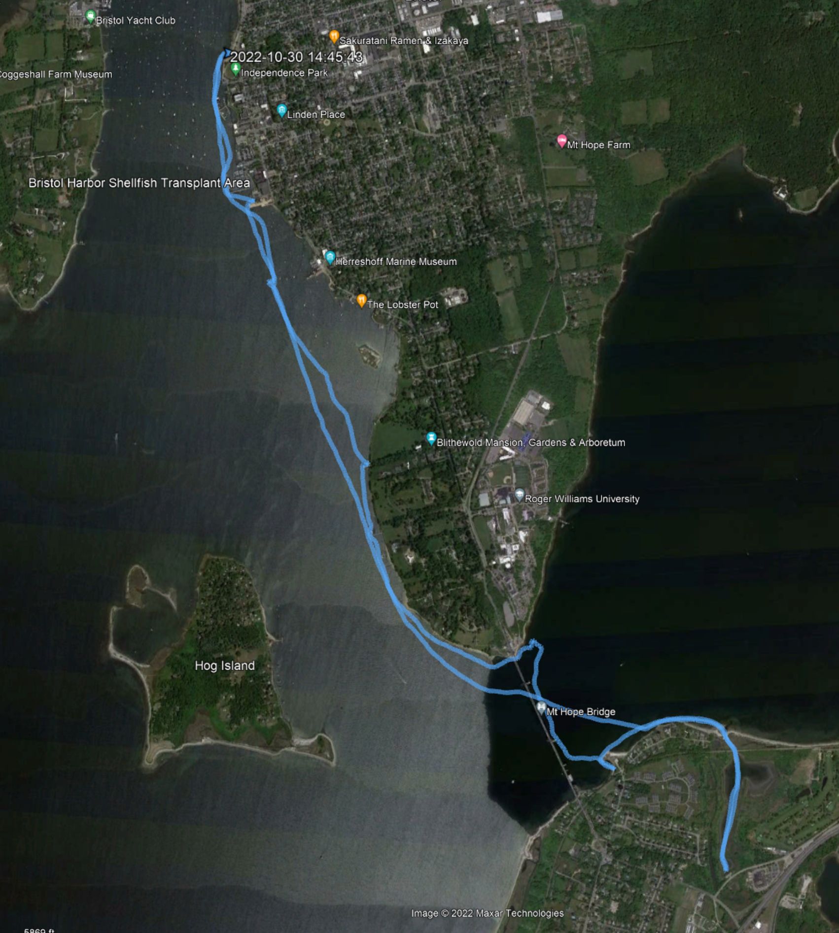 RICKA - Bristol Harbor paddle - October 30, 2022 - A paddle from Bristol Harbor Independence Park south to visit the Bertha K. Russel Preserve. In Bristol Harbor we noticed a large trimaran in a bad shape. This sailboat is an 80 ft carbon fiber ocean racer which was damaged shortly after start of the Newport to Bermuda race June 17, 2022. Currently waiting for repairs, or maybe just scraping. Several articles explain the accident. Rolex Middle Sea Race and Wild start for Newport Bermuda Race When reaching the Russell Preserve we found it to be a quiet pond bordered by dense Phragmites. To locate the route on Google Earth, use this gpx link. The paddle route is in this image.