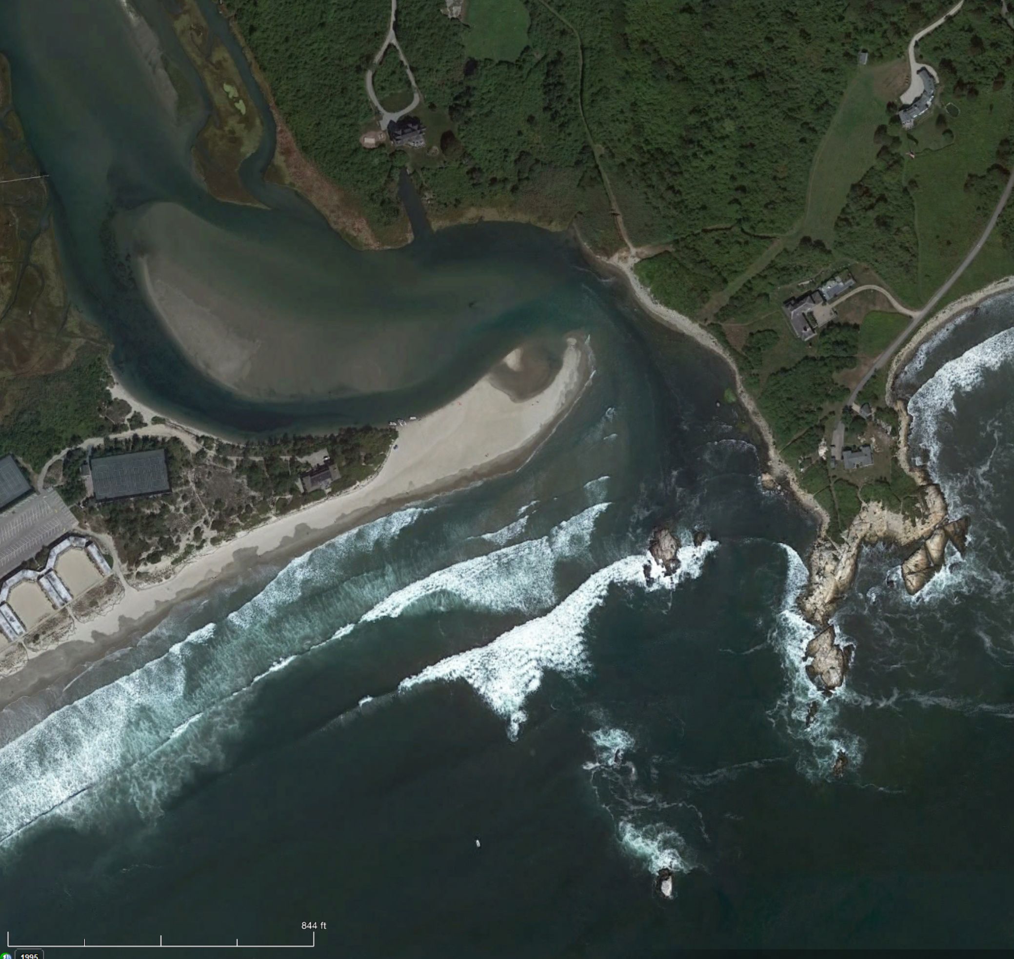Pollock Ave to Narrows, RI - August 21, 2020 - This is a day kayaking from Pollock Ave public access, down the Pettaquamscutt river to the Narrows at Narragansett, RI. Nice warm weekday without summer crowds on the sand spit at the Narrows. This image shows the paddle route. Tidal flow and storms move and manage the sand in the area from one season to another. Out going tide this day provided two nice float downs into the Narrows. The outdoing tide and the strong on-shore wind caused rough water conditions at the entrance of the Narrows. A life was lost in similar conditions when recreational kayakers came down the Narrows in cold weather and capsized. Our second float shows the wave action. To locate the route on Google Earth, use this gpx link.