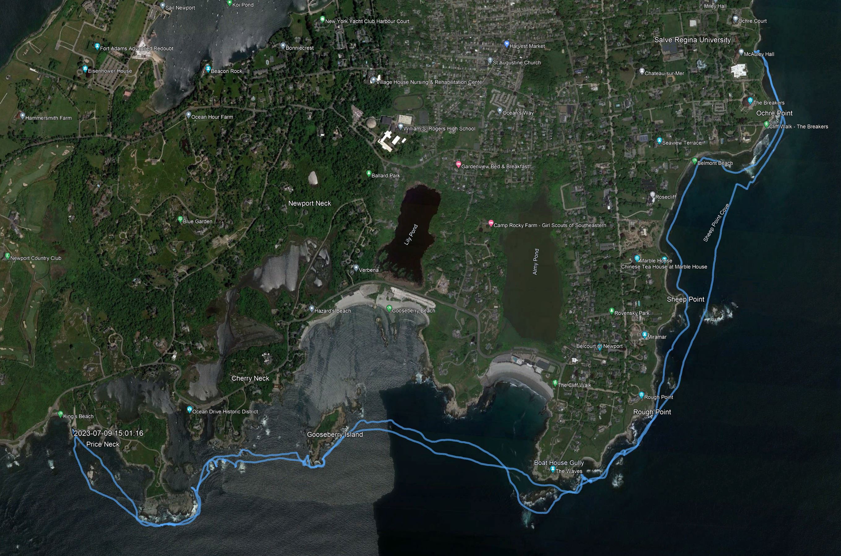 RICKA - Kings Beach Rock Gardening - July 9, 2023 - Ocean kayaking along the southern coast of Newport, RI. The L3-4 paddle consisted of rock gardening play, from the Kings Beach ramp eastward to the coastline along the Newport Cliff Walk. The air was in the 70's and the water temperature was 70F. The wind was calm to little and no wind chop. The ocean swells were minimal but with enough energy to make it a worthwhile paddle. To locate the route on Google Earth, use this gpx link. The paddle route is in this image.
