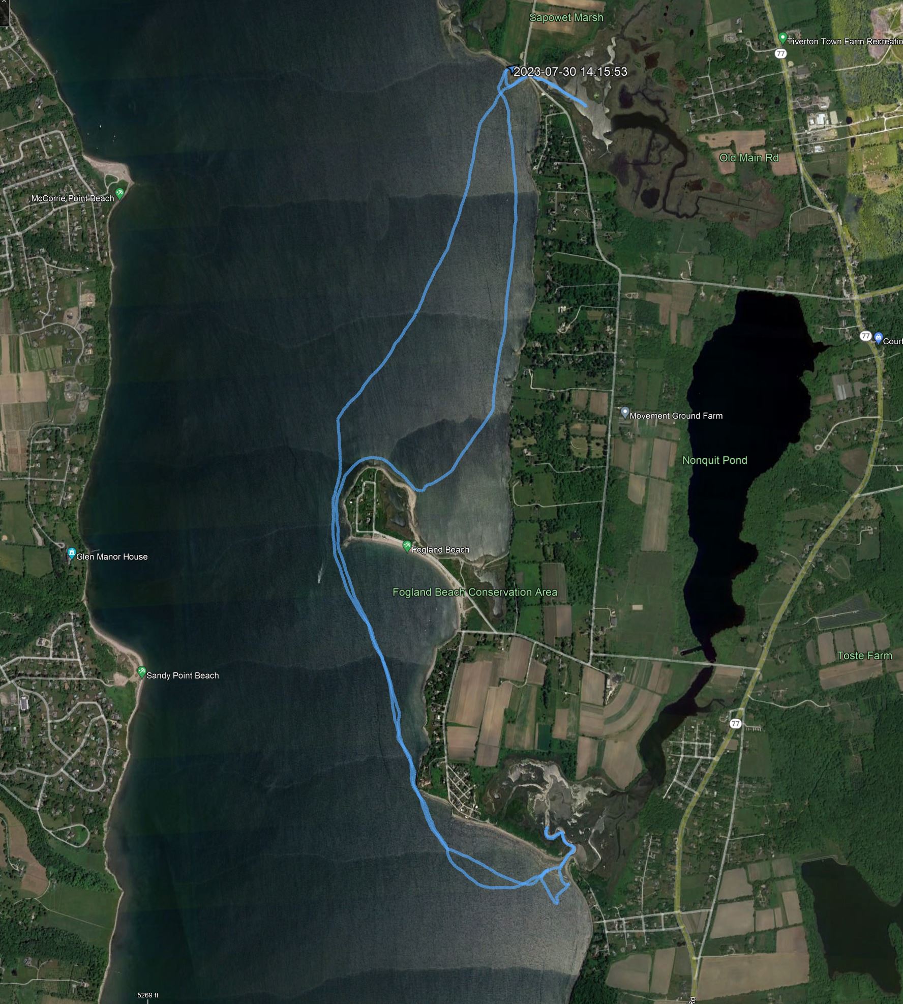 RICKA - Fairhaven to West Island - July 8, 2023 - Perfect Summer day from Fairhaven, MA, Edgewater dirt ramp with glassy conditions. Warm air with water about 70F and little wind. The paddle was about 9 miles in a loop around West Island. To locate the route on Google Earth, use this gpx link. The paddle route is in this image.