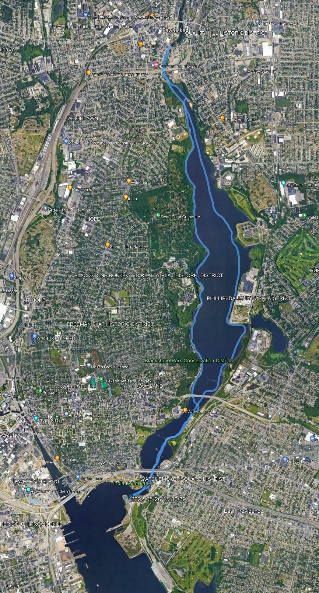 Bold Point Park to Pawtucket Falls - May 26, 2022 - Only two of us doing a Spring paddle from the Bold Point Park boat ramp up the Seekonk River to the Pawtucket Falls. The Falls are just below the historic Slater Mill and dam. A breezy day with a strong wind from the south eased paddling upstream but was a workout going back to the launch. The shoreline has scraps and remnants of many vessels that have been abandoned to just decay away. The Falls today has an operational hydro station just below the Falls. This accounts for the volume of water flowing out from the brick building on the west bank. To locate the route on Google Earth, use this gpx link. The paddle route is in this image.