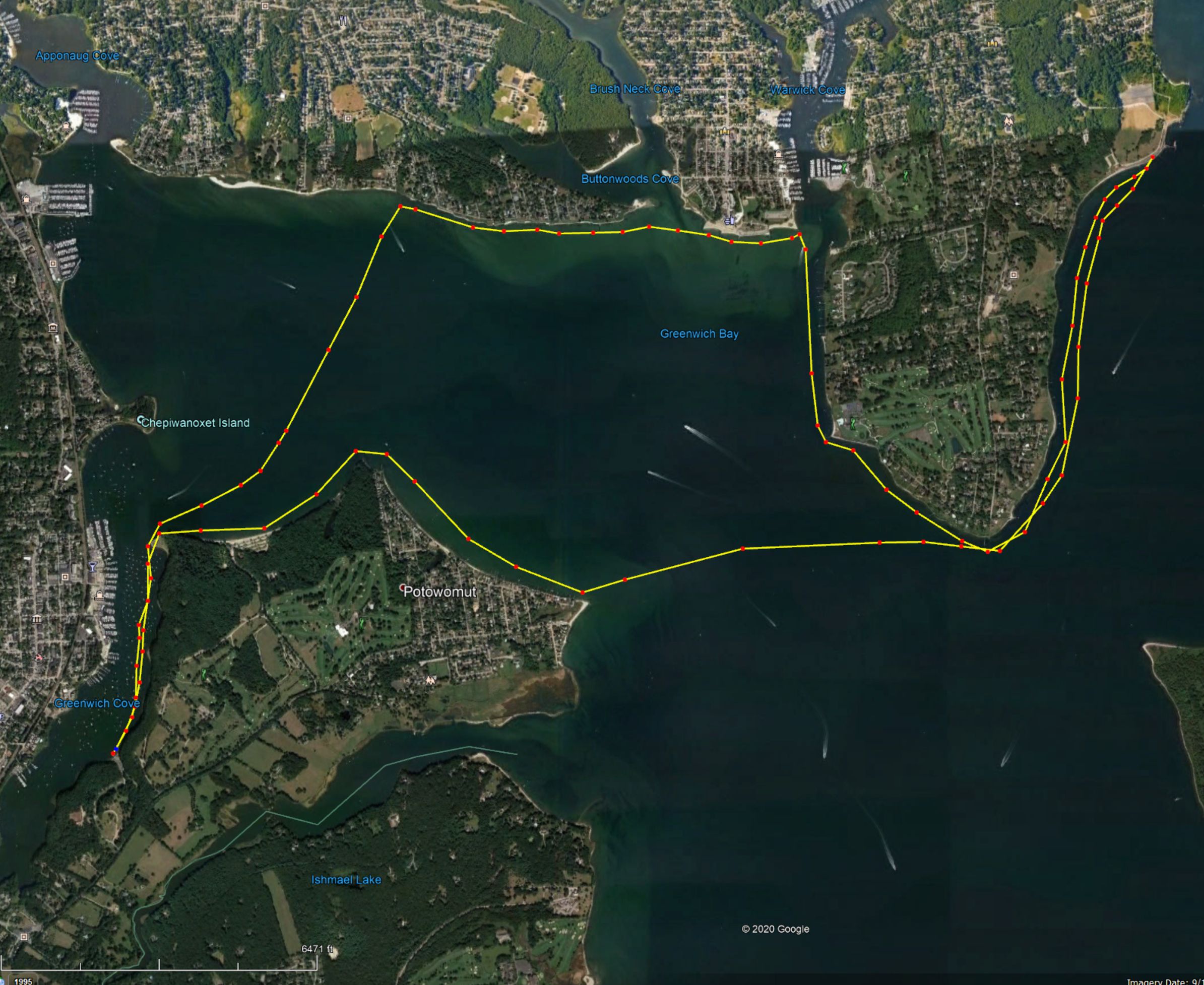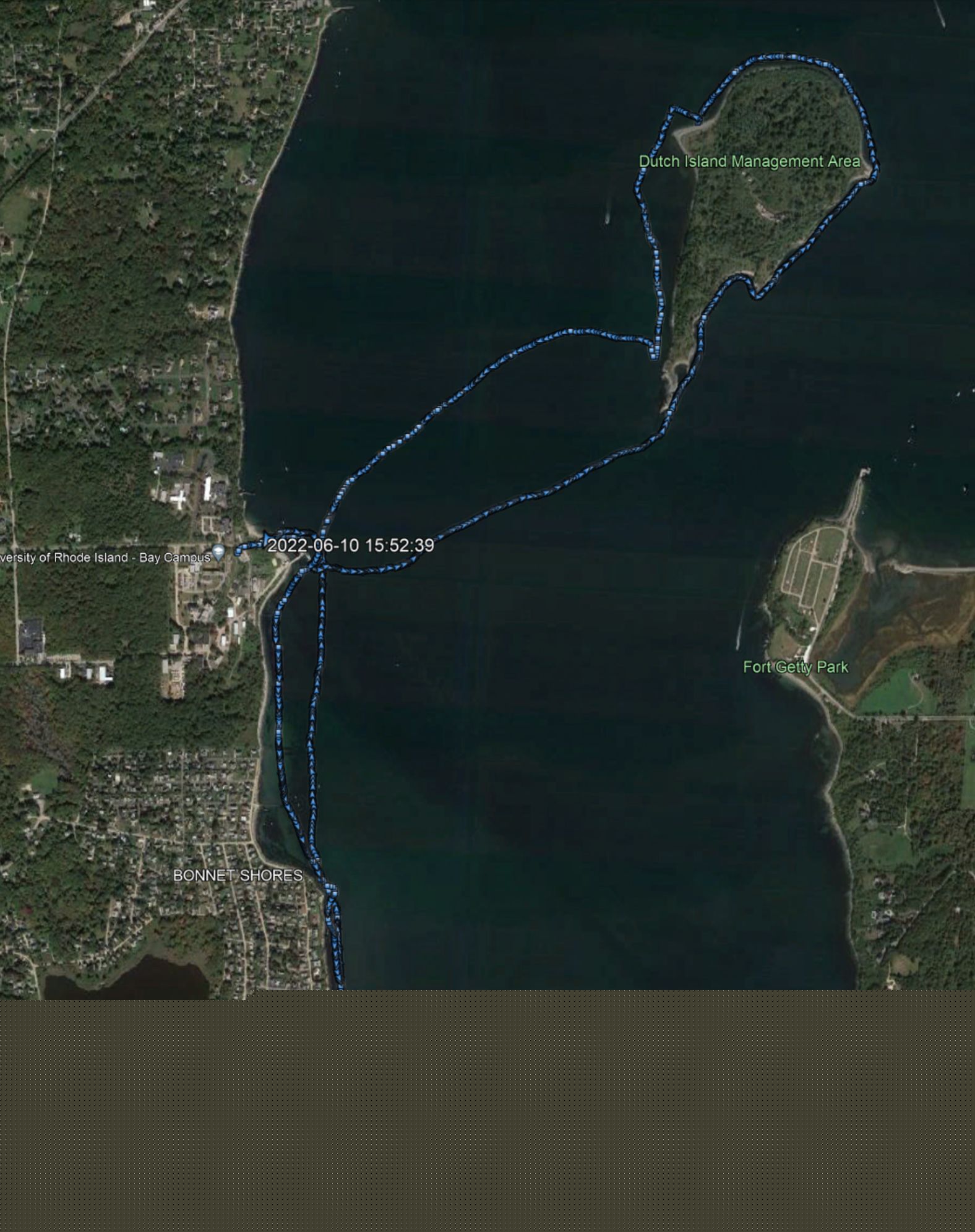 URI Bay Campus to Dutch Island - June 10, 2022 - A easy paddle to Dutch Island turned out to be an accidental viewing of the Newport Regatta. We were taking a lunch break on the north beach and there appeared several sailboats heading north in the west passage. Then to be followed by dozens more. Some ordinary day sailers, but also included several classical 12 meter race boats and several newer racing boats. Spoiler: our chatter about the boats was reminiscent of NFL talking heads between plays. On heading back to the Bay Campus we decided to extend the paddle to the south down Bonnett Shores. Work on the new dock for the Endevor was observed. To locate the route on Google Earth, use this gpx link. The paddle route is in this image.