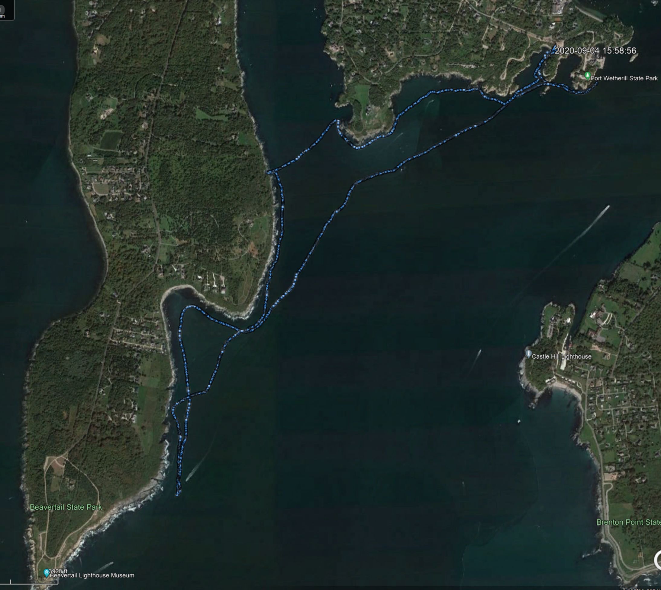 Beavertail Point, Jamestown, RI - July 26, 2019 - This is an edited down version of a full video to follow. The weather was perfect, sunny, in the mid 70's with a light onshore breeze. Leaving from the URI Bay campus, the conditions were such that we decided it would be a nice day to head out to Beavertail. On the way out we stopped to see the natural blow hole. Even mild swells produced a nice spray. Since the sea was pretty calm we paddled out to the outer buoy off Beavertail point. Coming back in from the buoy we stopped to view the small surf off Beavertail. To locate the route on Google Earth, use this gpx link. The Google Earth route is in this image.