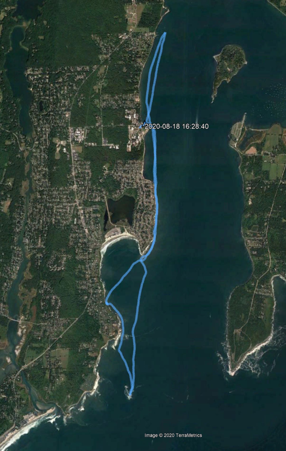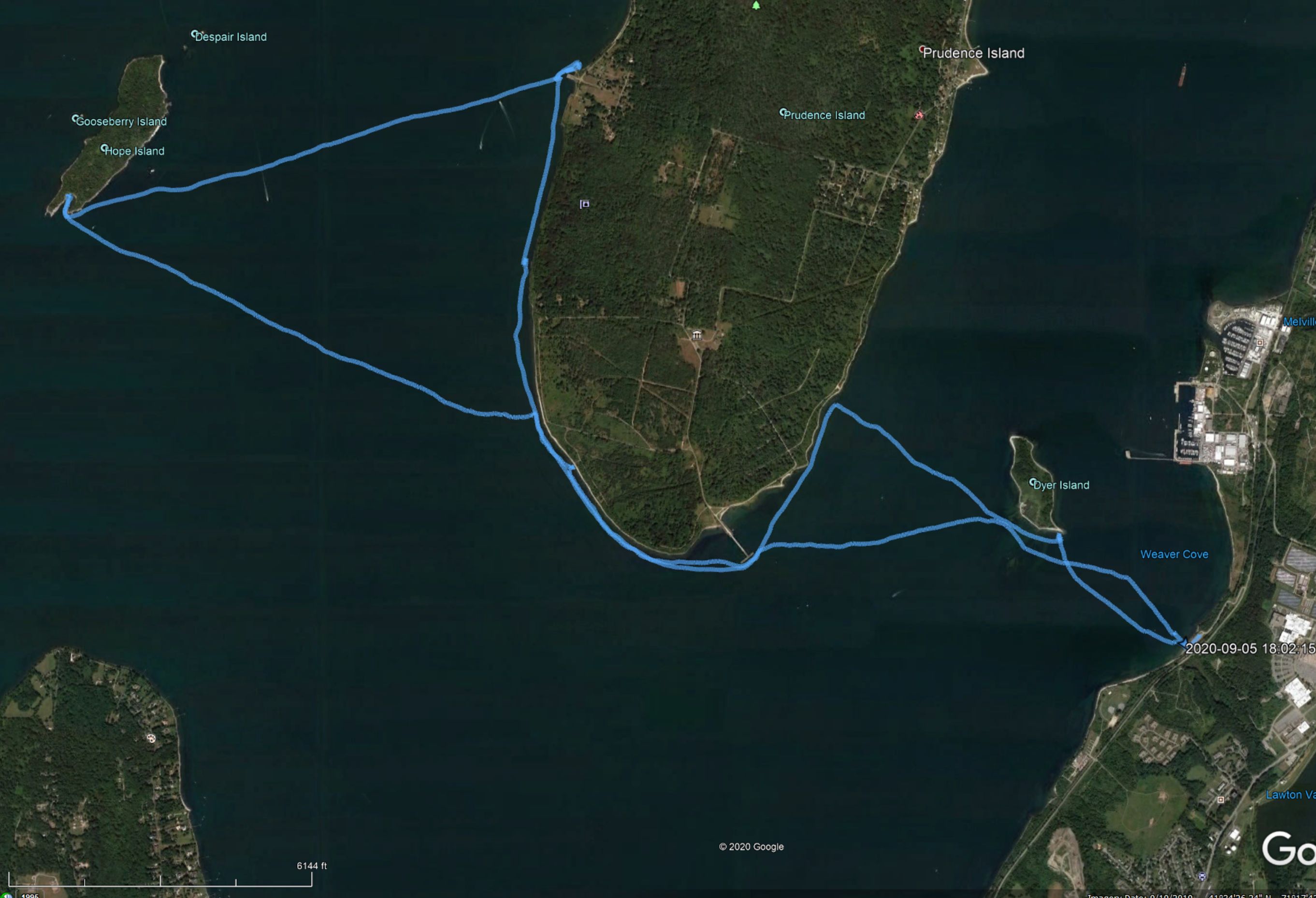 URI Bay Campus to Whale Rock, RI - August 18, 2020 - A Level 2 paddle from the URI Bay Campus to Whale Rock in Narragansett Bay. The wind was from the south southwest and our route was in the lee of land for most of the paddle, making it an easy and pleasant paddle. When we lost the land protection from the wind, the 15 kt wind made the paddling more difficult and produced a quick chop to Whale Rock. Once at the rock, the natural smallish cove on the NW did not give the protection that I expected for my paddling partner. It would be proper to call it Level 3 around the rock. So we only stayed for a few minutes before turning around and heading back north. Heading back was much easier with the onshore wind and following sea. The air and water temperatures were in the 70's so it was a pleasant paddle, with a touch of excitement. To locate the route on Google Earth, use this gpx link.The Google Earth route is in this image.