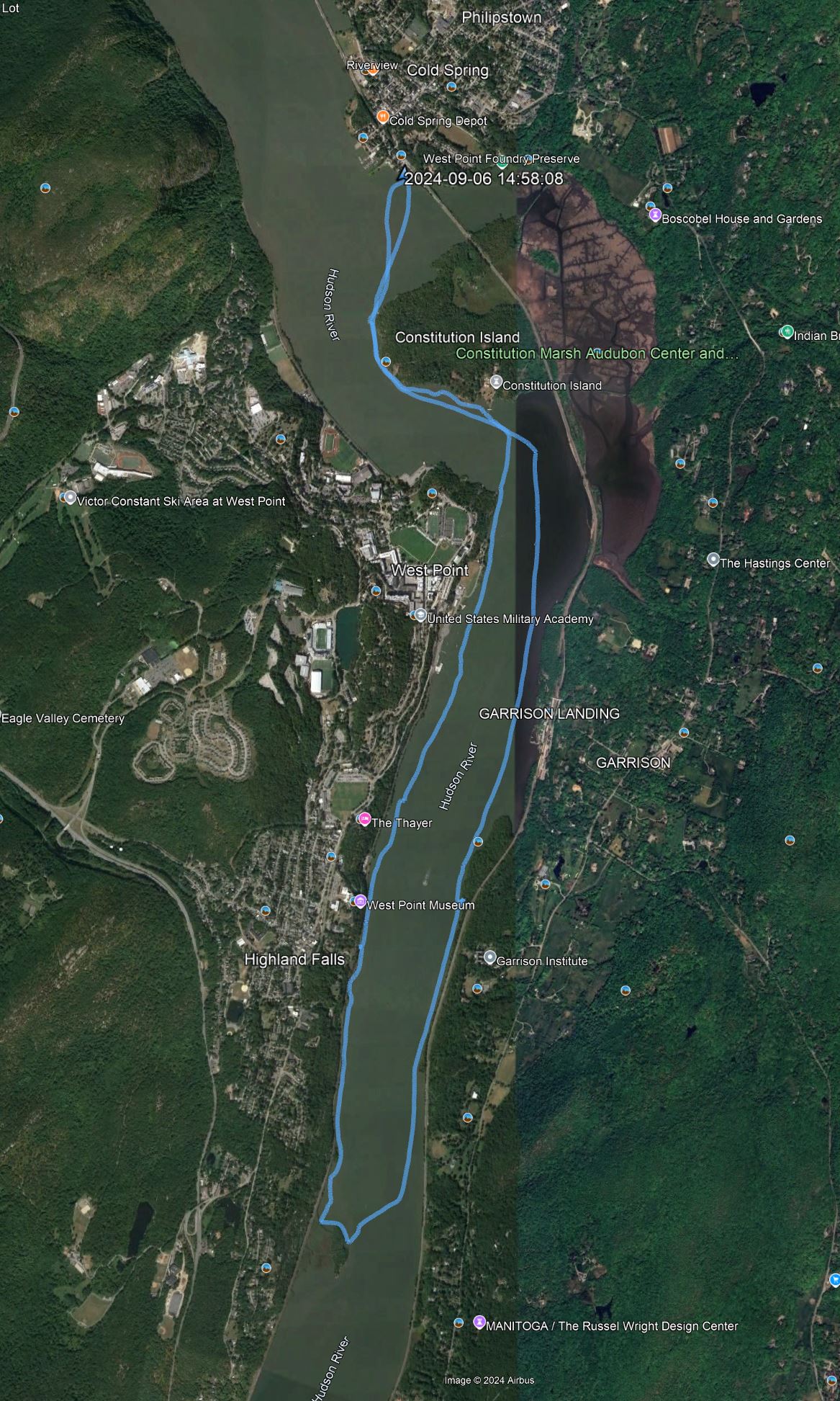HRGF - Hudson River tour September 6, 2024 - A guided tour down the Hudson River during the Hudson River Greenland Festival. An event featuring Greenland traditional kayaks and technique. More info at www.hrgf.org To locate the route on Google Earth, use this gpx link. The paddle route is in this image.