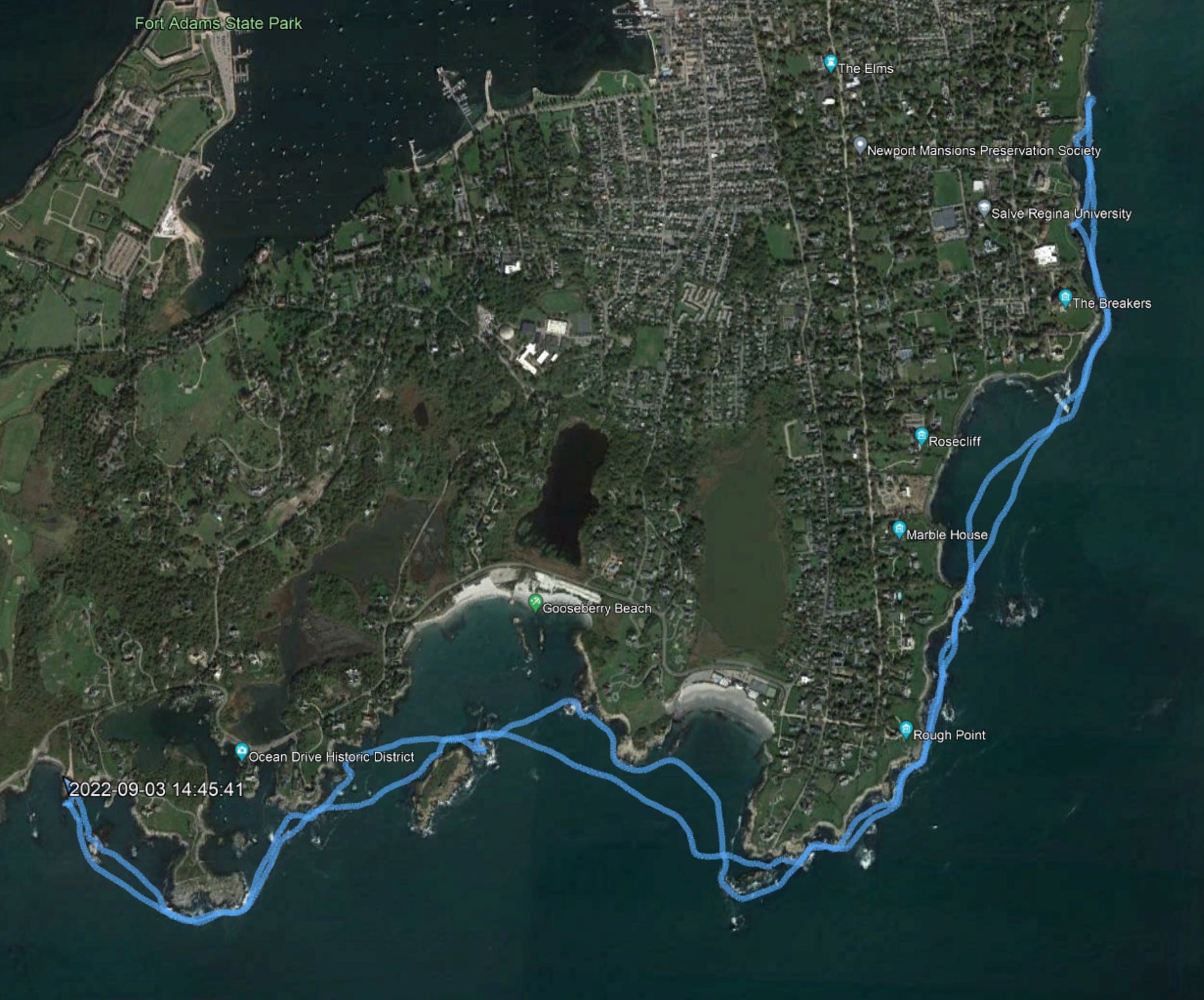 RICKA - Kings Beach to Cliff Walk 40 Steps . - September 3, 2022 - A Ricka sea kayaking paddle from Kings Beach off Ocean Drive to the Cliff Walk at 40 Steps overlook. The ocean was clam with no swells and very little wind. Limited rock gardening but a nice easy tour for about 9 miles. This route always passes the spectacular Seafair mansion on the cliff which was purchased in 2017 by Jay Leno. See this article on the estate. And this collection of photos. Or this collection of photos. This was Labor Day weekend so the Cliff Walk was crowded. Also viewed was the section of the Cliff Walk that collapsed, resulting in partial closure of the walk way. To locate the route on Google Earth, use this gpx link. The paddle route is in this image.