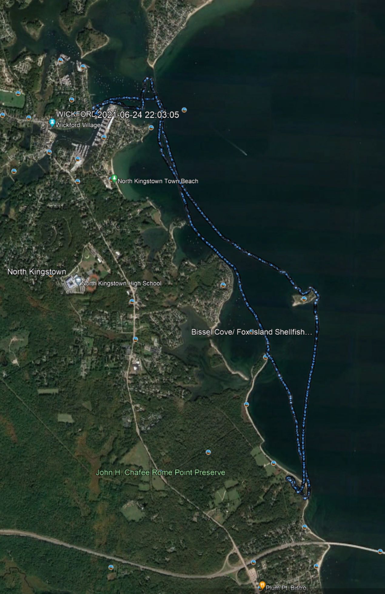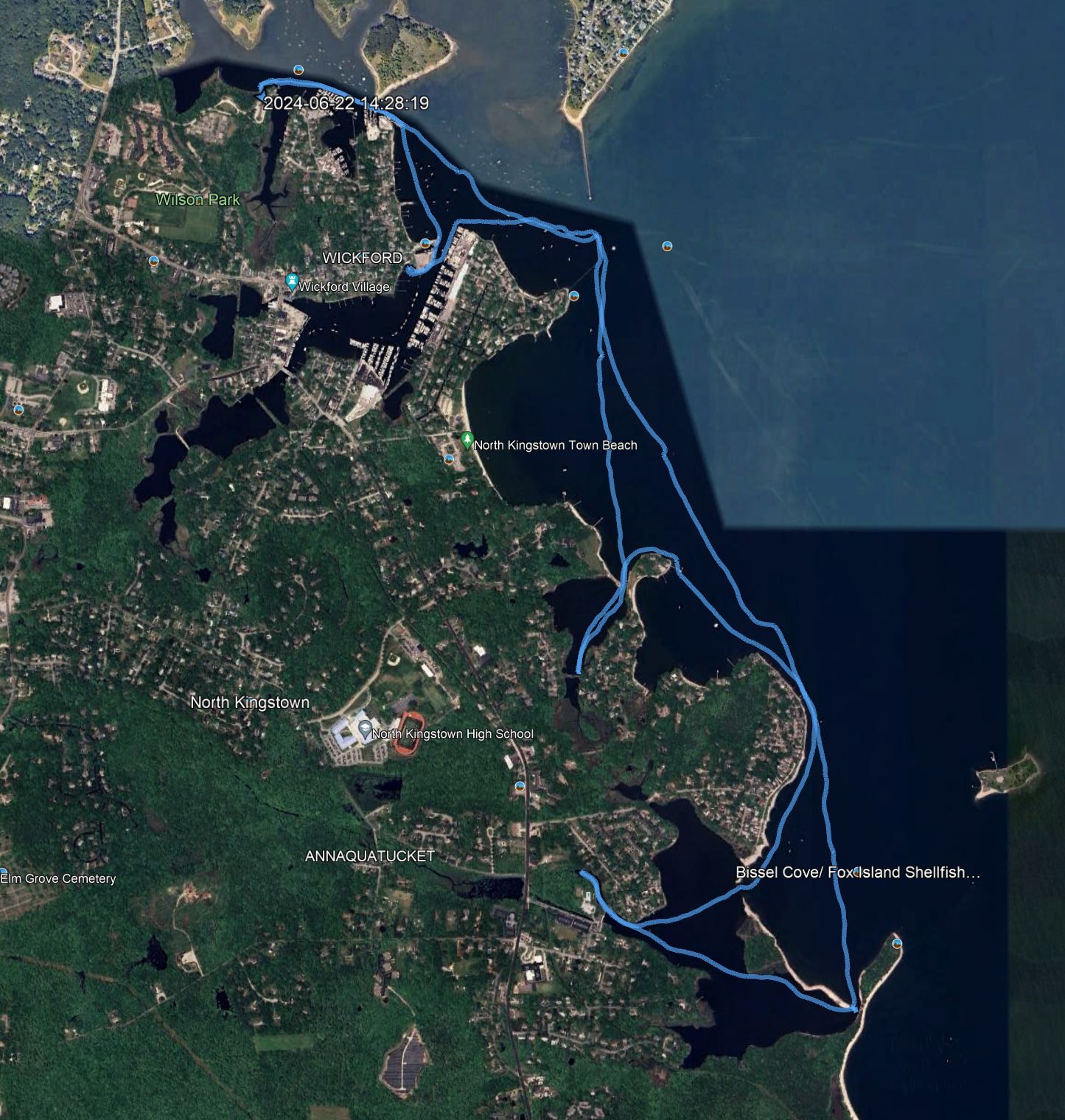 RICKA - Wickford to Rome Pt. June 22, 2024 - This Ricka paddle was a Level 2 from Wilson Park in Wickford, RI. An overcast day, but warm and humid with hardly any wind in the morning and only a slight breeze in the afternoon. A very lazy paddle, pleasant without a hot Sun beating down on the water. To locate the route on Google Earth, use this gpx link. The paddle route is in this image.