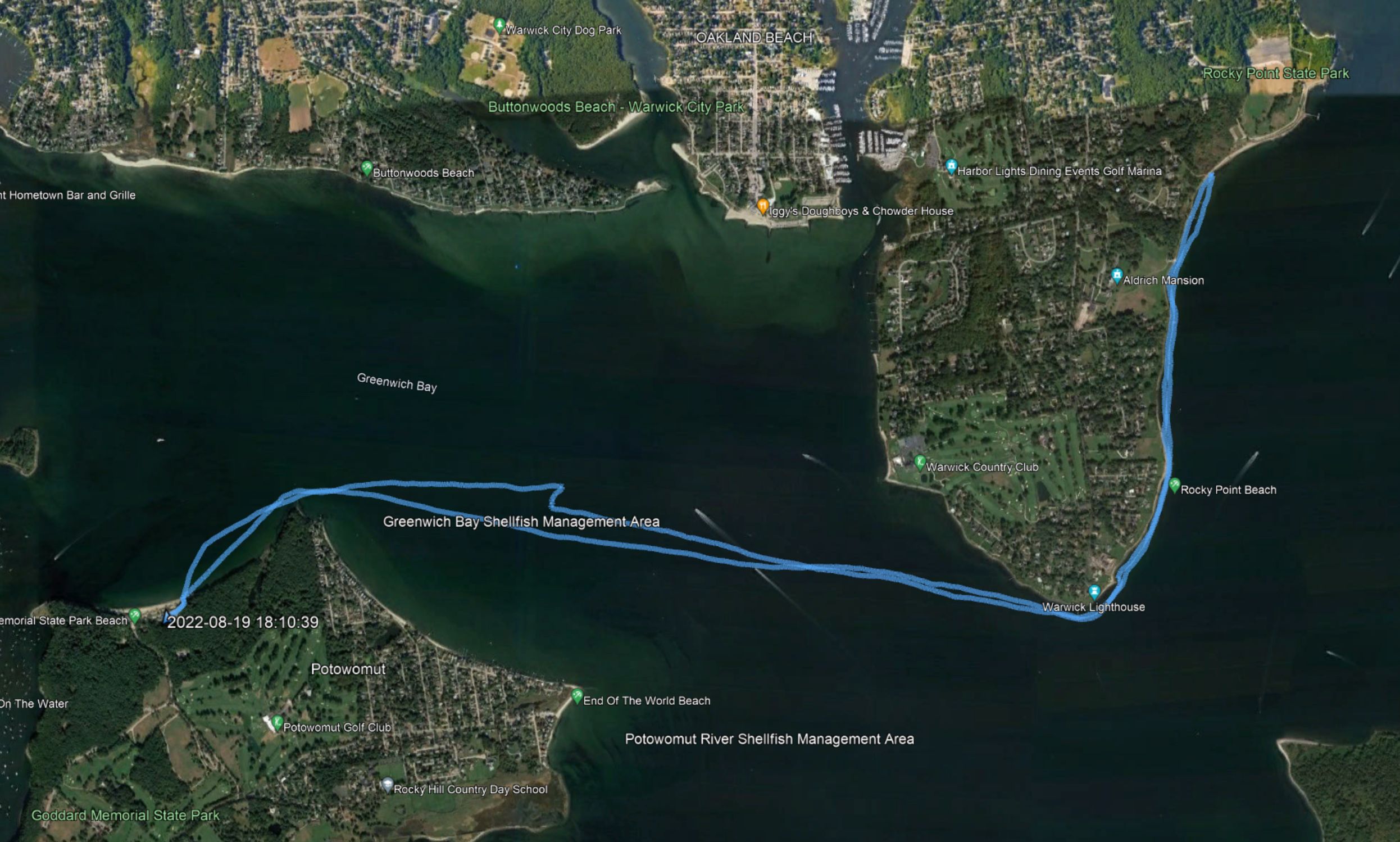 Goddard Park to Rocky Point - August 19, 2022 - A nice paddle on warm day in 80's from Goddard Park beach, passing Warwick Neck to Rocky Point. About 9.5 miles of which the last 2.5 miles were into the wind which gusted to over 20 mph with white caps on and off. The NOAA chart of wind is here. A good workout for an hour. To locate the route on Google Earth, use this gpx link. The paddle route is in this image.