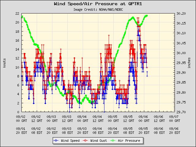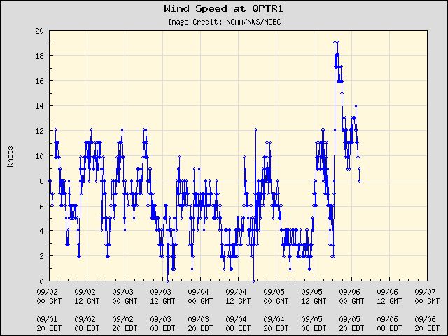 Weaver Cove to Hope Island, RI - September 5, 2020 - A long day of paddling from Weaver Cove to Dyer Island, to Prudence Island, to Hope Island and back. Returning to Weaver at 6:00 pm. The day was quite interesting because of a front passing at about 3 pm. This caused a spike in wind from the southeast resulting in a heavy wind chop as we exited Hope Island. These images show NOAA plots of the wind and of wind gusts peaking at 15 hrs EDT. The other kayakers in our group got back to Weaver Cover ahead of the rough water.