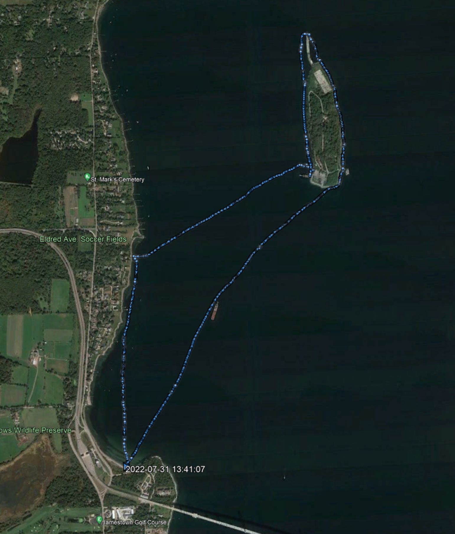 RICKA - Potter Cove to Gould Island - July 31, 2022 - This was a Ricka Level 2 paddle from Potter Cove, Jamestown to Gould Island in Narragansett Bay, RI. The island was a torpedo test site during WW2 and recently has been cleaned up by the Corp of Engineers for the State of Rhode Island. There are rumors of making it into a State camping facility. Although I doubt the financial feasibility of the project. And of course that would ruin all the opportunities for stealth camping. The northern section of the island is still under control of the U.S. Navy. To locate the route on Google Earth, use this gpx link. The paddle route is in this image.