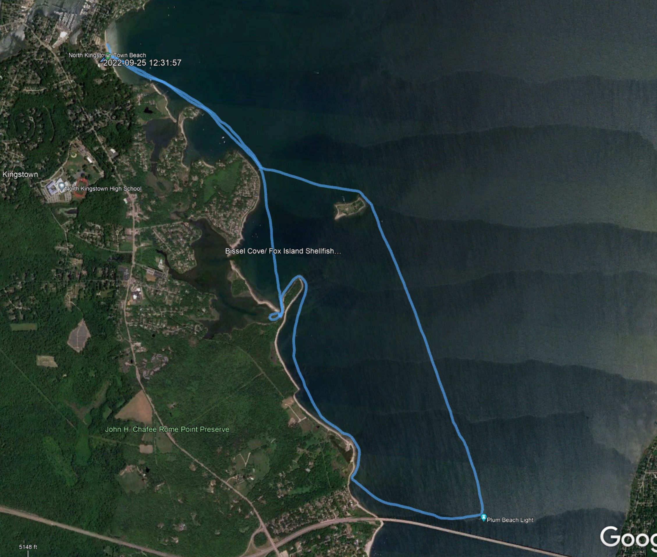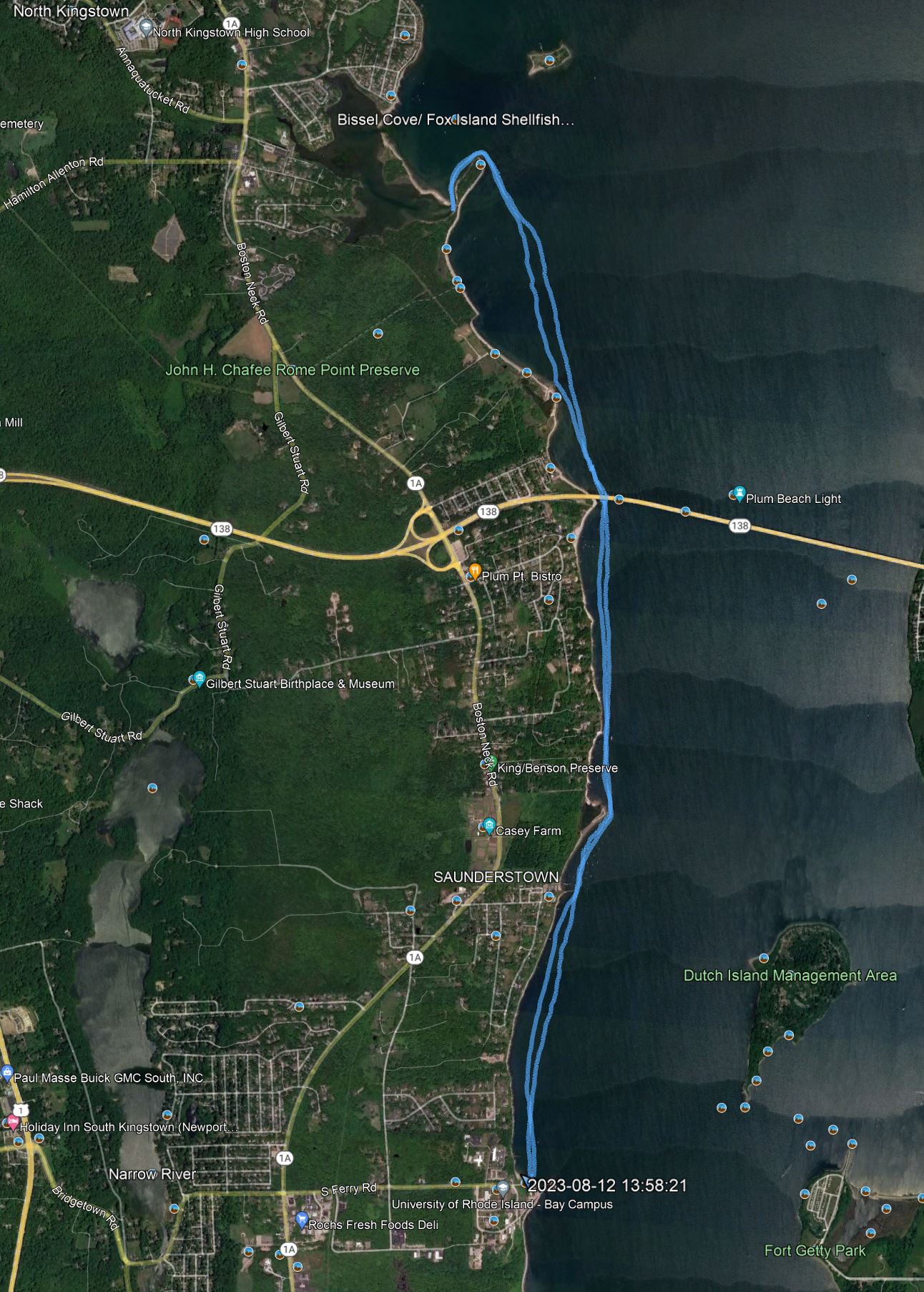 RICKA - URI Bay Campus to Rome Pt - August 12, 2023 - A Ricka paddle, from the most popular launch site, URI Bay campus beach, north to Rome Point in Bissel Cove. A pleasant summer paddle with no real waves or chop in sunny conditions. To locate the route on Google Earth, use this gpx link. The paddle route is in this image.