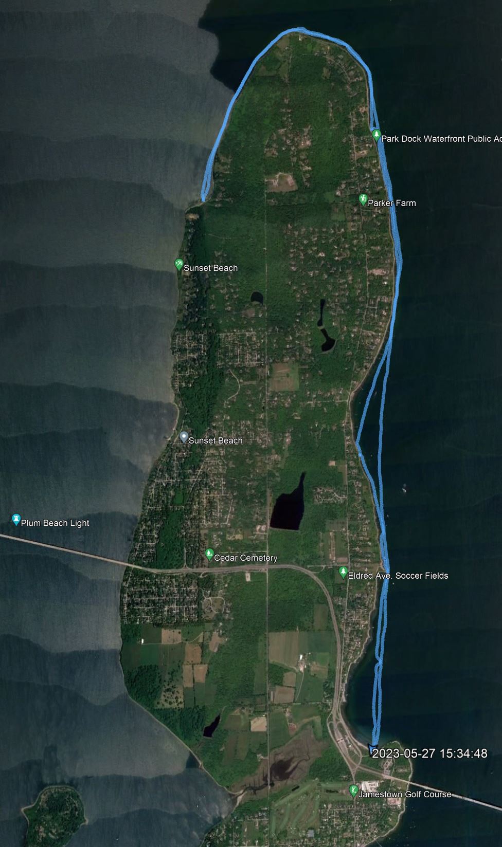 RICKA - Potter Cove paddle - May 27, 2023 - A sunny Spring day for an easy paddle up the east shore of Jamestown from Potter Cove. Many exclusive homes on this side of Jamestown with long docks. Only one public access at Broad St which is pretty much limited to residents of Jamestown. Around the northern end, the only landing place is Sandy Point some distance down the west side of the island. By the time we paddled back, the on-shore breeze picked up to 10-15 mph so it was a stiff paddle back to Potter cove. To locate the route on Google Earth, use this gpx link. The paddle route is in this image.