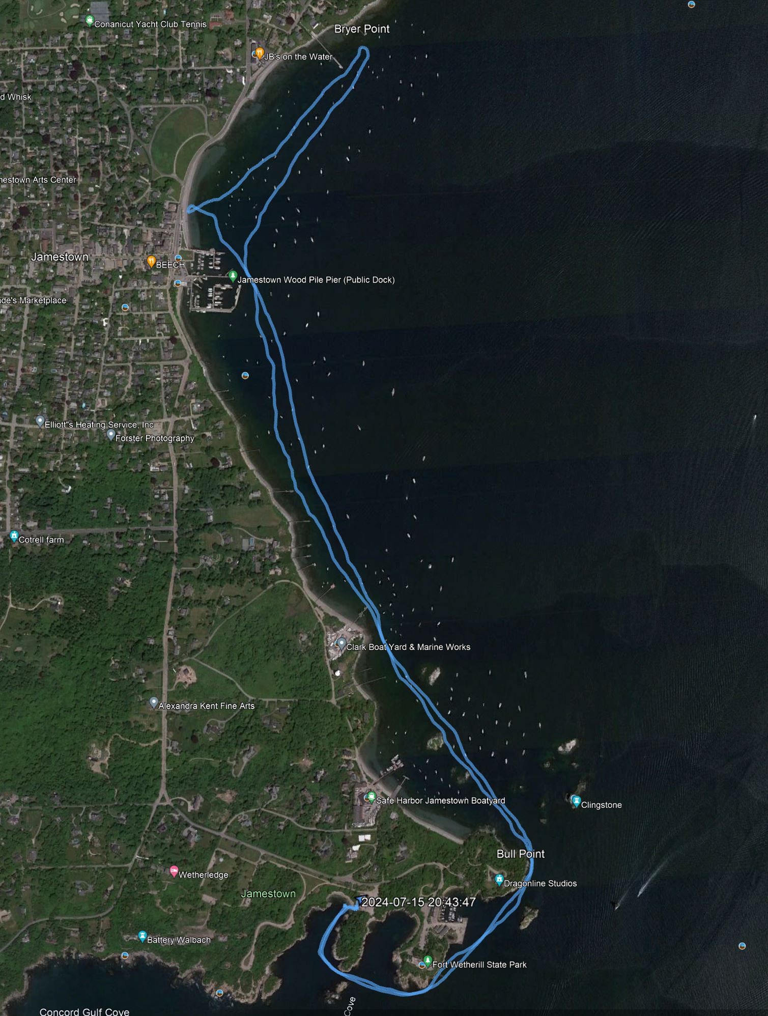 Potter Cove to Ft. Wetherill - August 6, 2022 - This paddle was on the day of the "Save the Bay" swim from Newport to Jamestown, at Potter Cove. When Ann finished paddling in the Safety Squad, she waited for me to join her for a paddle on a hot day. The temperatures in Providence were up to 90F, so there was going to be a strong on shore breeze from the ocean. Our plan was to paddle south before the wind got too strong and use the wind to bring us back to Potter Cove. We paddled about 7 miles round trip into the Scuba cove at Ft Wetherill and back. The onshore breeze picked up on return, causing a few difficulties offshore at Ft Wetherill. To locate the route on Google Earth, use this gpx link. The paddle route is in this image.