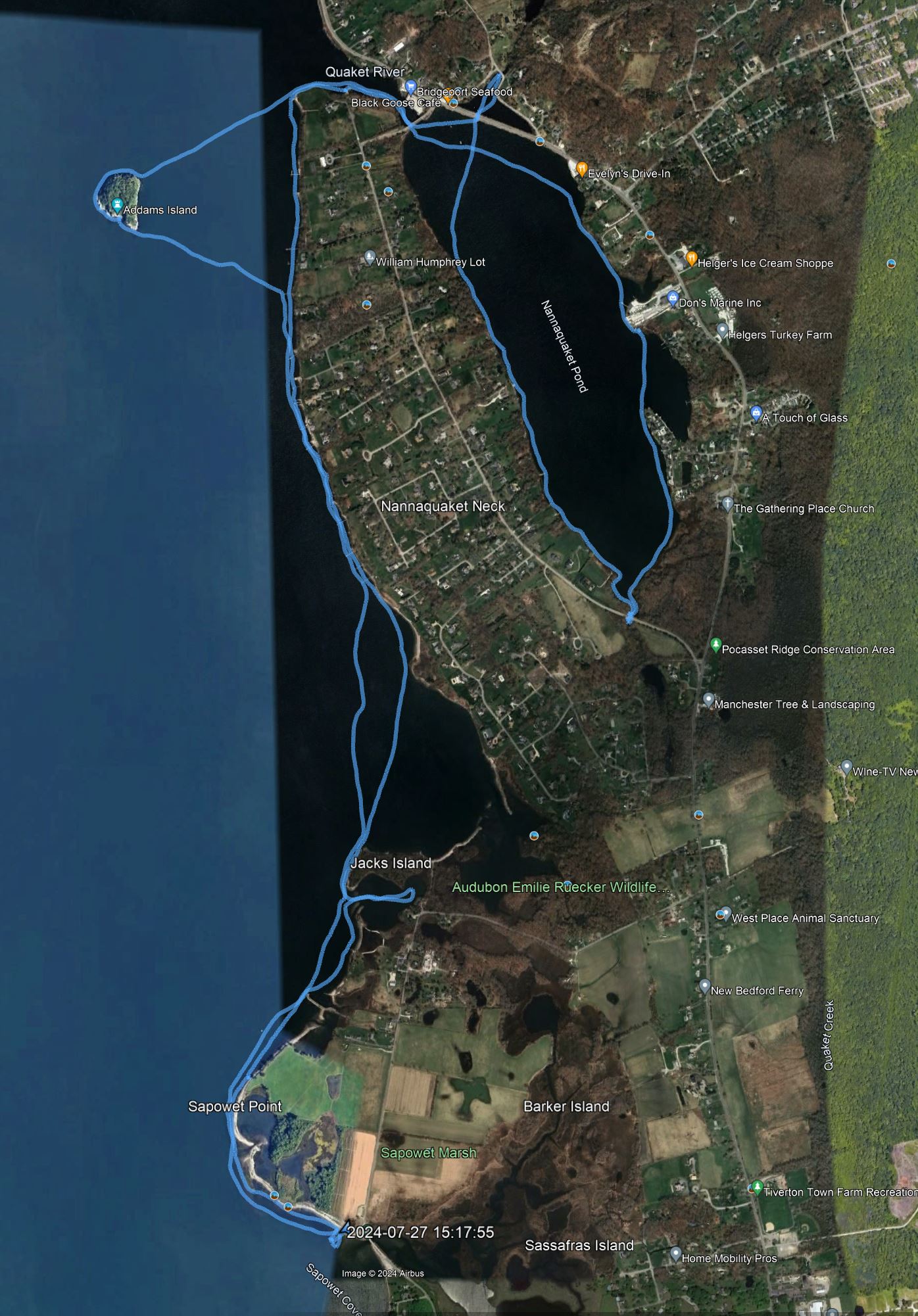RICKA - Sapowet paddle north, July 27, 2024 - A L2 paddle from Sapowet beach northward to look at Addams Island and Nannaquaket Pond. Weather was hot and calm until an ocean breeze picking up in the afternoon. To locate the route on Google Earth, use this gpx link. The paddle route is in this image.