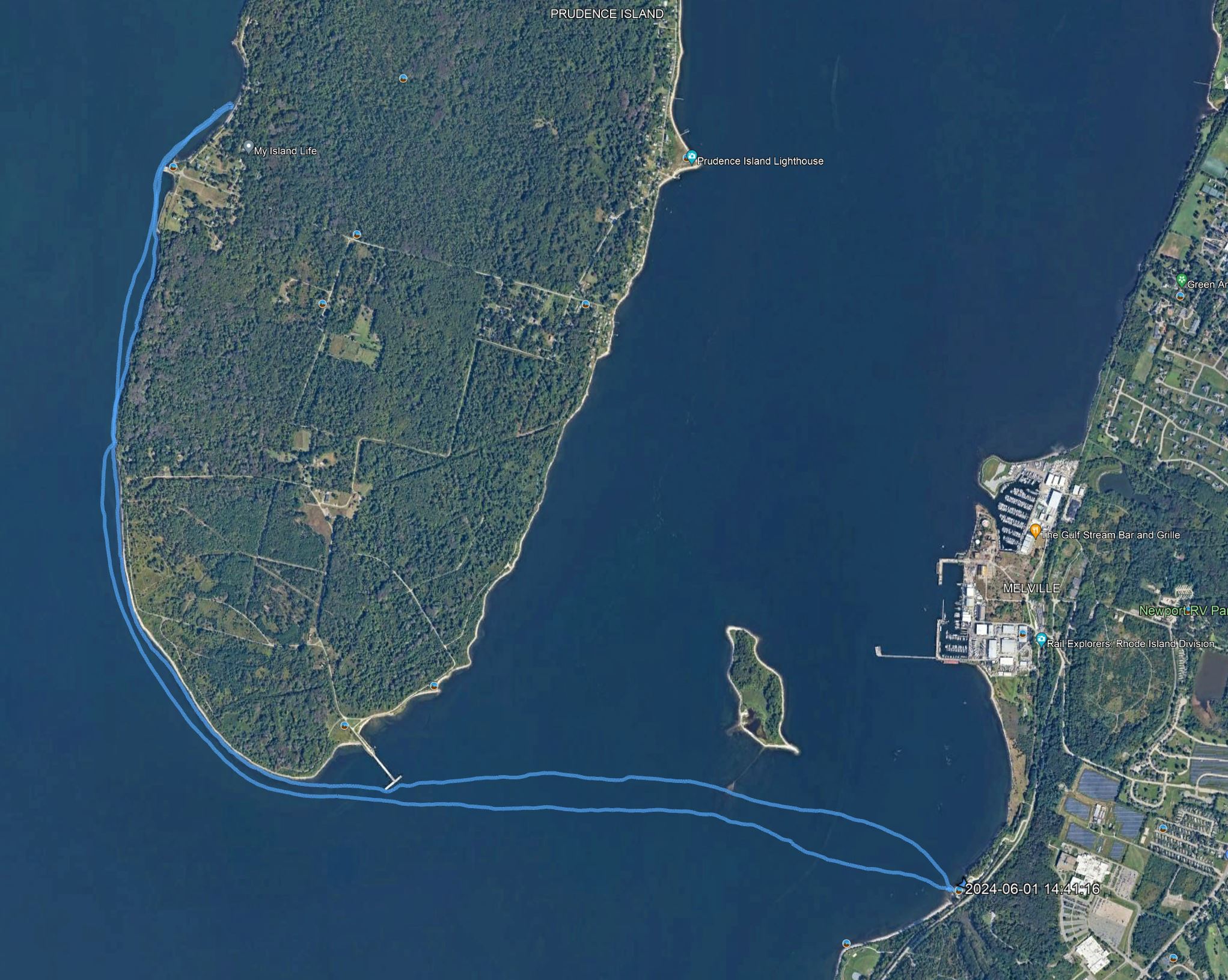 RICKA - Weaver Cove to Prudence Island June 1, 2024 - This Ricka paddle was a Level 2 from the State launch at Weaver Cove. The route passed the little Dyer Island and proceeded under the south end of Prudence Island. On the west side the paddle was only half way up Prudence to a stone beach just north of the Broadway stone pier. A very calm day with water almost glassy. To locate the route on Google Earth, use this gpx link. The paddle route is in this image.