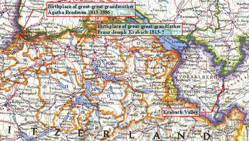 Map showing the birthplaces of my great-great-grandparents in Binningen and Baden, Switzerland, and the relationship with the Krabach Valley area in Western Austia. The distance between Binningen and Baden is about 35 miles. From Badden to the Krabach Valley, about 90 miles as the crow (krahe) flies. Married about 1840 in Baden and had their first of 8 children in Ohio, United States, about 1840. So both emigrated at the age of 27. Genealogy from Beth Benoit, NH. (Click on map to enlarge.)