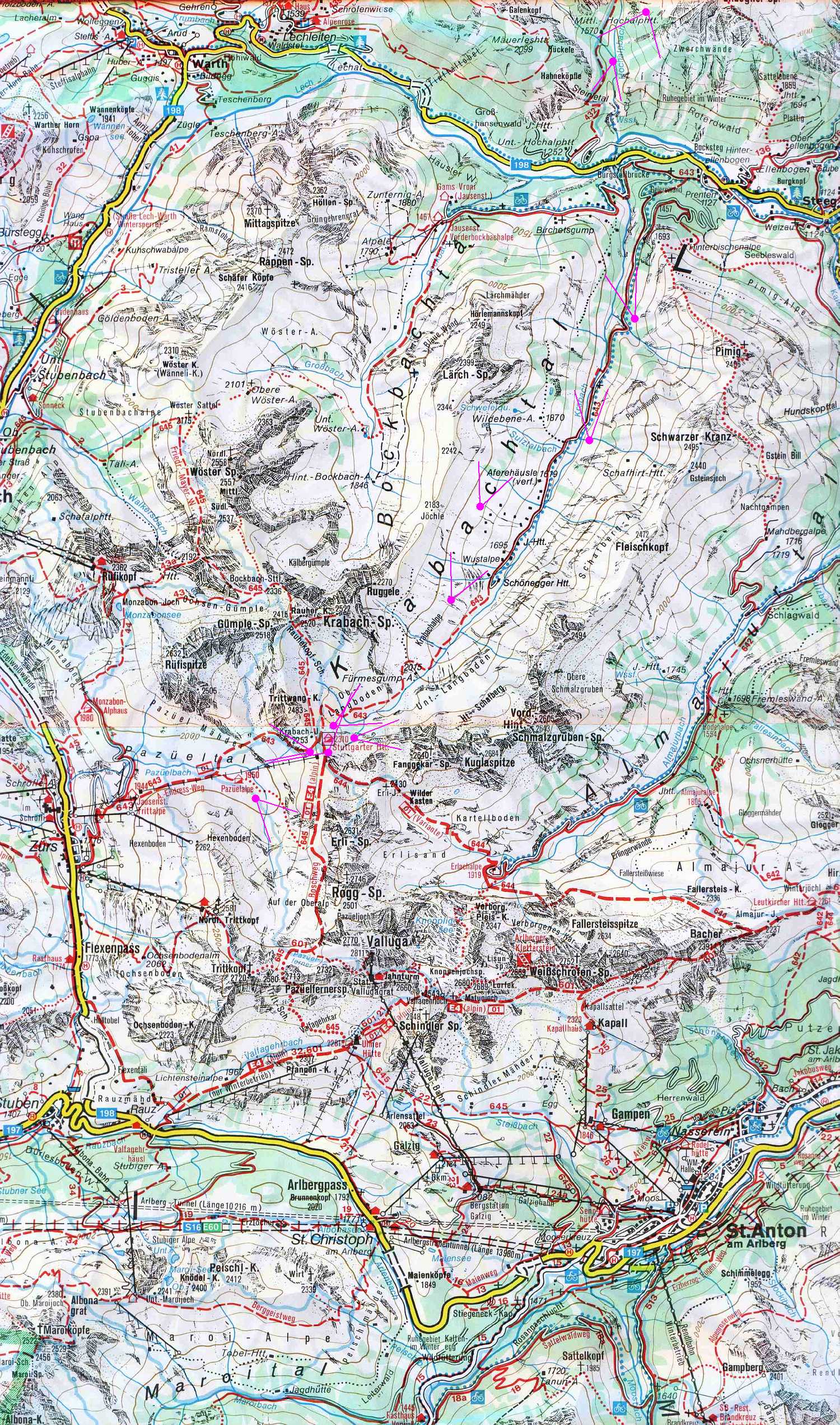 Topographic map section adapted from Kompass map no. 33 (Arlberg) showing hiking trails, ski trails and roads. (www.kompass.at) Map section centered around the Krabachtal (Krabach Valley). Up is North. (Click on map to enlarge.)