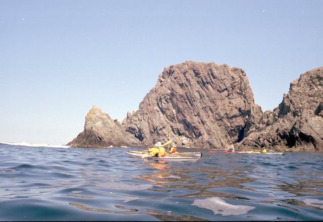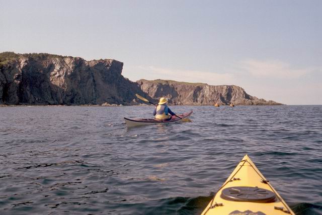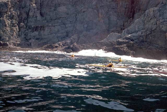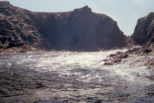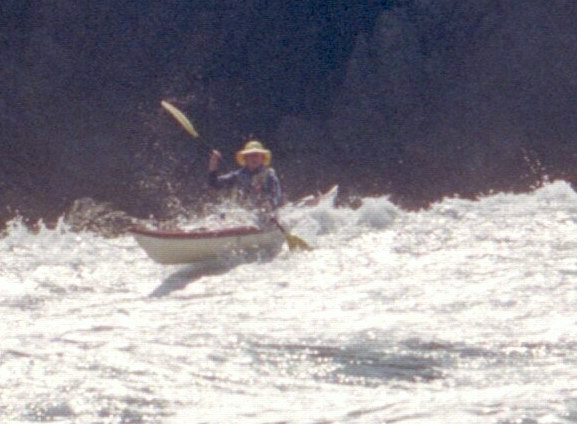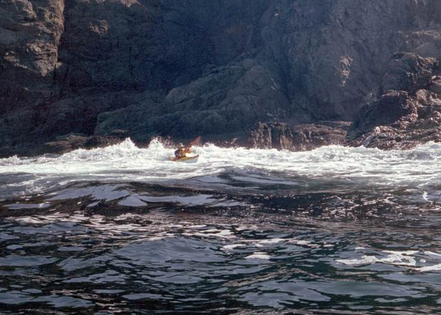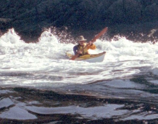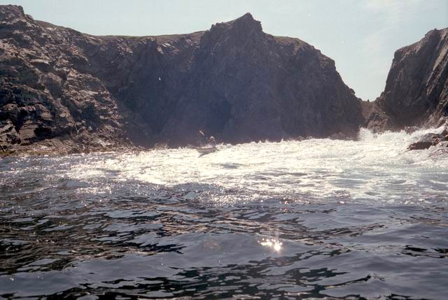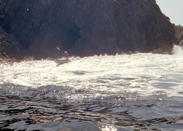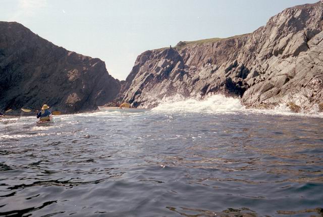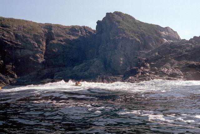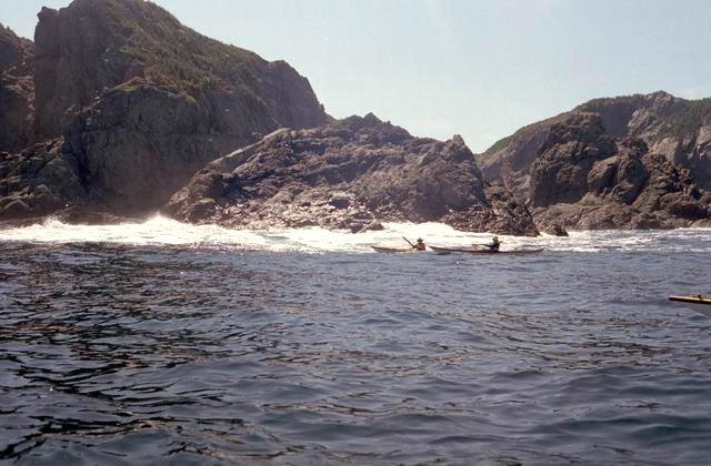 After paddling around Long Point we pulled into a sheltered beach that had a open cave in the cliff. It was about 25 ft by 15 feet and about 15 feet high. During normal weather the cave is open and dry but during a Northeaster storm it probably floods. After we had lunch and layed around for awhile we headed farther south into Harts Cove. While going along the coast several members of our group kept close to the waves breaking on the rocks. While the waves did not accually break on the rocks, the surge up and back out made for good “rock garden” playing. The photos (03crop10.jpg and the next 2 enlargements) show Alison making it out from almost being trapped behind a heavy ocean swell as it was lifting into a small cove. The height and bulk of the swell can be visualized, considering that the photos are being taken from about 3 feet above the water surface. After paddling into the quiet Twillingate Harbor about half way we headed back. The last three photos show a set of enlargements of John as he battles out through a large breaking swell. The next page shows the rest of his effort to get out.