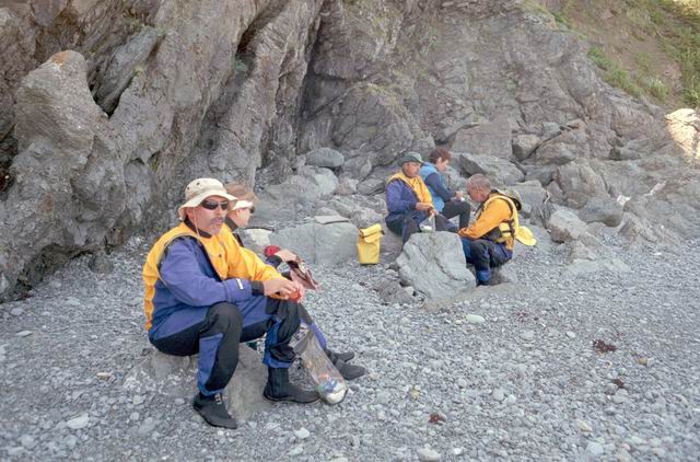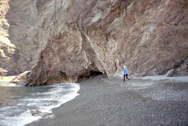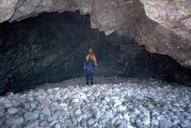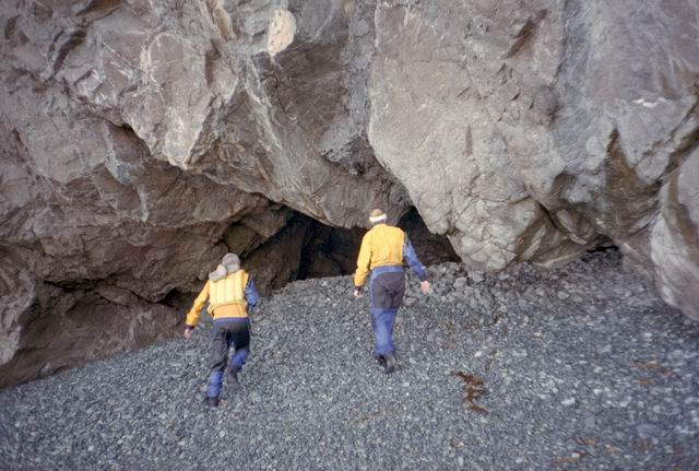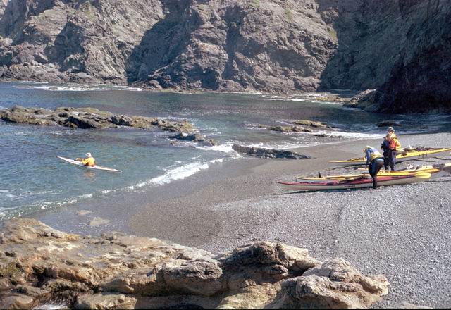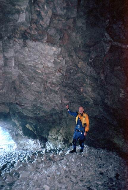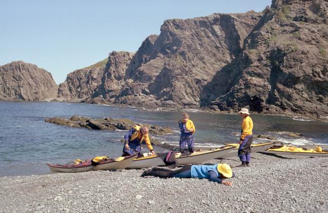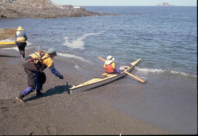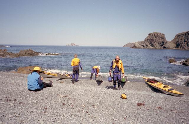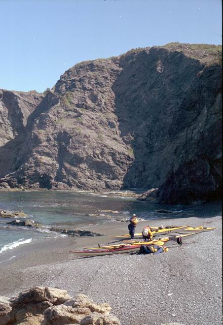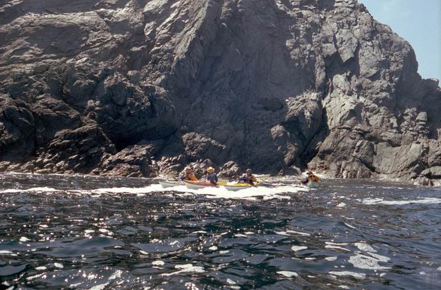 After paddling around Long Point we pulled into a sheltered beach that had a open cave in the cliff. It was about 25 ft by 15 feet and about 15 feet high. During normal weather the cave is open and dry but during a Northeaster storm it probably floods. After we had lunch and layed around for awhile we headed farther south into Harts Cove. While going along the coast several members of our group kept close to the waves breaking on the rocks. While the waves did not accually break on the rocks, the surge up and back out made for good “rock garden” playing. The photos (03crop10.jpg and the next 2 enlargements) show Alison making it out from almost being trapped behind a heavy ocean swell as it was lifting into a small cove. The height and bulk of the swell can be visualized, considering that the photos are being taken from about 3 feet above the water surface. After paddling into the quiet Twillingate Harbor about half way we headed back. The last three photos show a set of enlargements of John as he battles out through a large breaking swell. The next page shows the rest of his effort to get out.