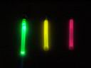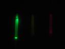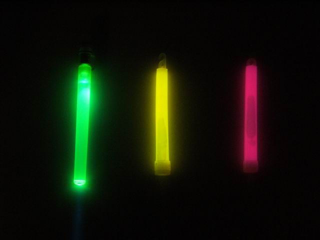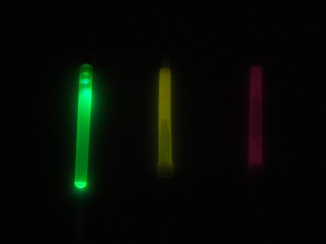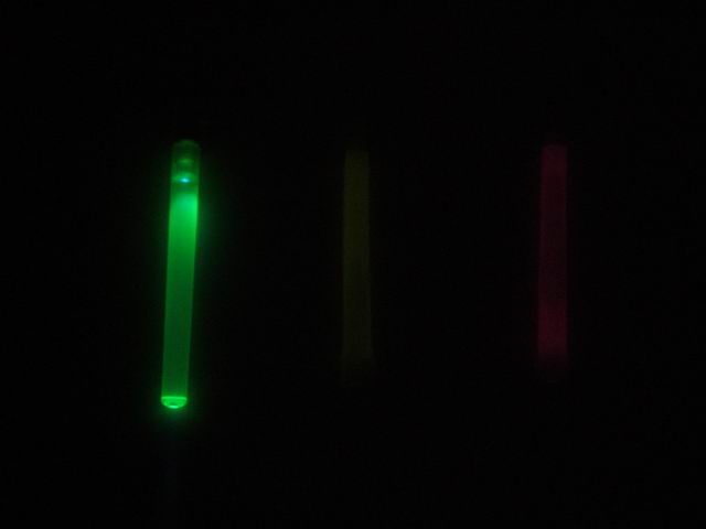 Three types of light sticks were compared as to brightness over a period of time. From left to right in the below photo, a battery operated Fun-Tastick Glo Lite ($2.48, but no longer available), a Walmart ($2.67 for two) chemical green glow stick, and an Ocean State Job Lot (cheap overstock and excess inventory store) 99 cent glow stick. The later was turned out to be red instead of green and unfortunately it slowly leaked after being snapped to activate.